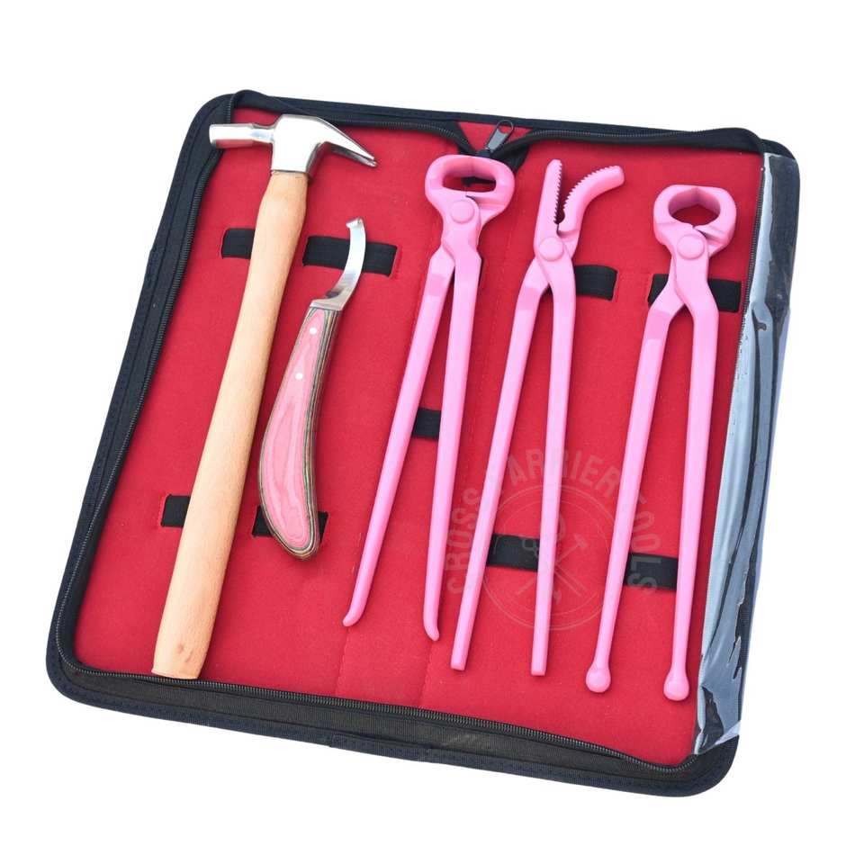 ชุดเครื่องมือช่างเกือกม้าสีชมพู พร้อมคีมตัดกีบ คีมย้ำกีบ และคีมย้ำกีบแบบจระเข้