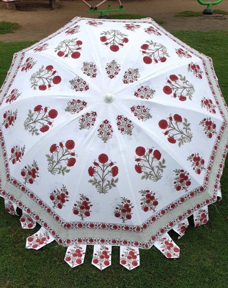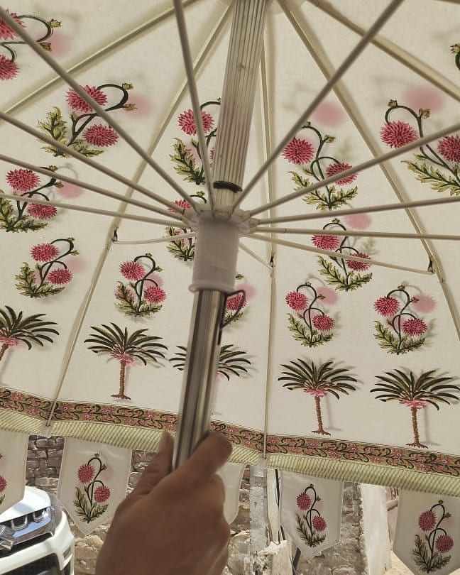 ร่มผ้าฝ้ายลายดอกไม้สีชมพู พิมพ์ลายด้วยมือ ร่มกันแดดทรงกลมสำหรับสวน ร่มกันแดดสำหรับลานบ้าน ร่มอินเดียโครงโลหะสีดำ