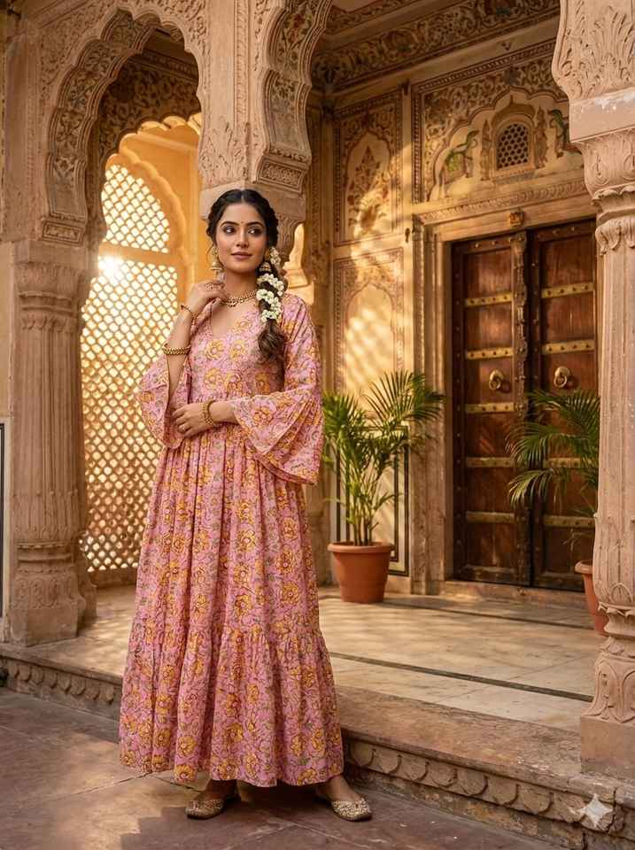 ชุดเดรสยาวผ้าฝ้ายพิมพ์ลายดอกไม้สีชมพู ทรงมิดิ แต่งระบาย คอวี สไตล์ชาติพันธุ์โบโฮ สำหรับฤดูร้อน เอวธรรมชาติ เป็นมิตรกับสิ่งแวดล้อม สไตล์อินเดีย