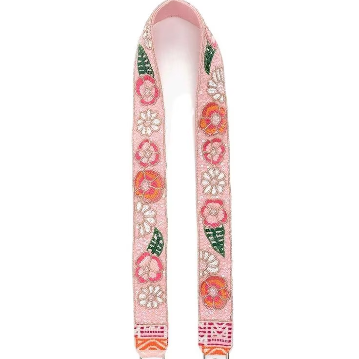 Pink Floral Embroidery Beaded Strap Handmade Decorative Bag Strap Custom Adjustable Fashion Purse Shoulder Belt Stylish New