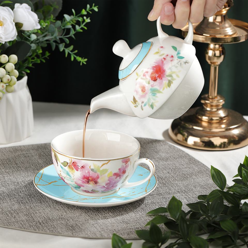 ชุดถ้วยชาพอร์ซเลนลายดอกไม้สีชมพูสำหรับหนึ่งถ้วยและจานรองถ้วยกาแฟอาหรับประดับทองสำหรับเป็นของขวัญ