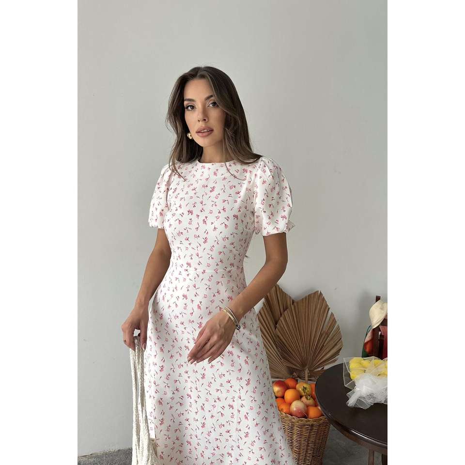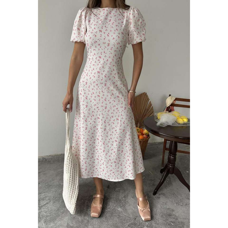เดรสทรงเอพิมพ์ลายดอกไม้สีชมพู เอวธรรมชาติ คอประดับเพชร ผ้าทอระบายอากาศ ใส่สบายๆ สำหรับทุกวัน