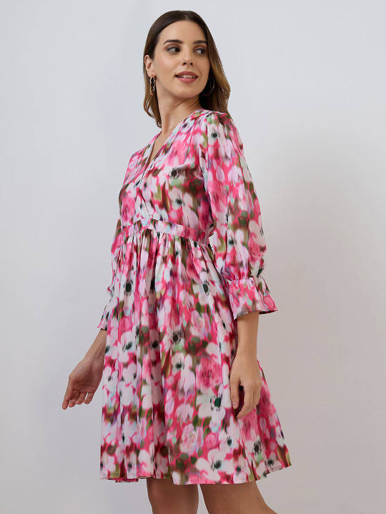 ลายดอกไม้สีชมพู เป็นมิตรกับสิ่งแวดล้อม ทรงหลวม เอวธรรมชาติ คอวี แขนพองสามส่วน ความยาวระดับเข่า ชายกระโปรงบาน ผ้าชีฟอง