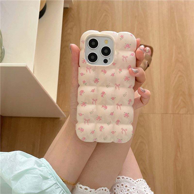 เคสโทรศัพท์ลายดอกไม้สีชมพูน่ารัก สไตล์ขนมปัง พร้อมโบว์ สำหรับ iPhone 16 Pro Max 13 14 12 11 เคสป้องกัน 3 มิติ สำหรับ iPhone 15 สีชมพู