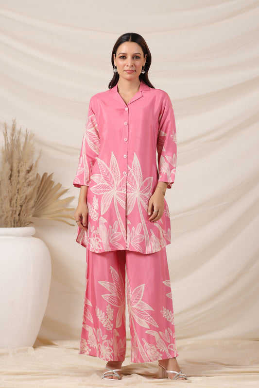 Silk Digital Printed Work Two-Piece Set for Bulk Daily Wear Pink Flower Handmade Daily Casual Co-Ord Set Customized Pure
