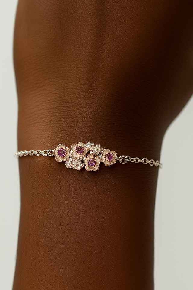สร้อยข้อมือรูปดอกไม้สีชมพูประดับทับทิม ออกแบบมาเพื่อความสง่างามอันละเอียดอ่อน แสงสีชมพูอ่อนละมุน สวยงามเหนือกาลเวลา เครื่องประดับสำหรับผู้หญิง ชุบทอง
