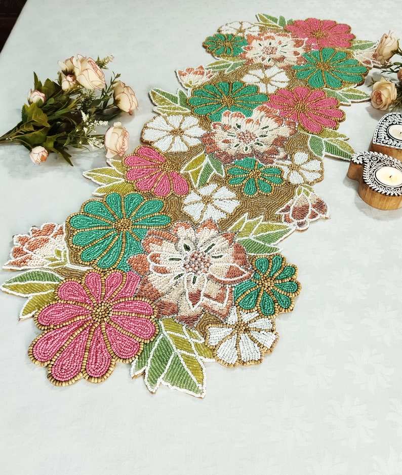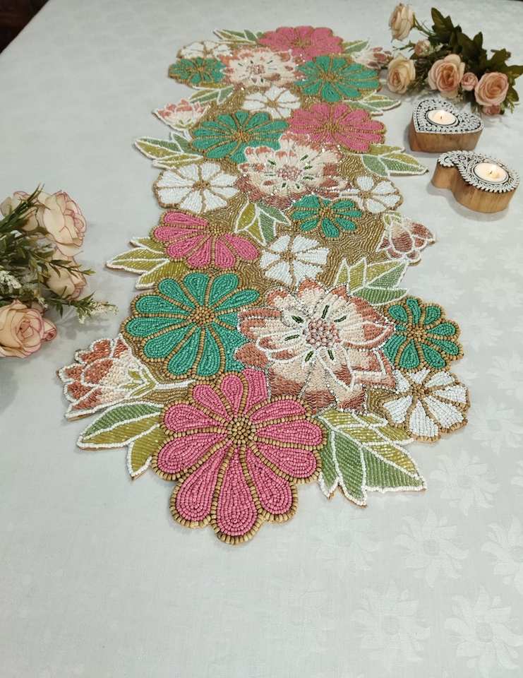 ผ้าปูโต๊ะลูกปัดแฮนด์เมดดอกไม้สีชมพู