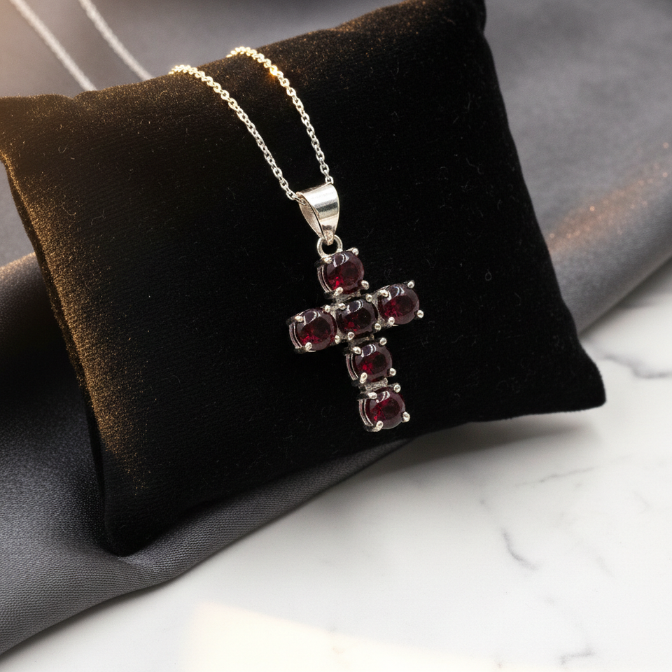 สร้อยคอจี้รูปกากบาทสีชมพูฟูเชียสำหรับผู้หญิง พลอยสังเคราะห์ขนาด 7 มม. ชุบทอง 18K ปราศจากนิกเกิล ตัวเรือนทองเหลืองแบบหนามเตย สไตล์โบฮีเมียน