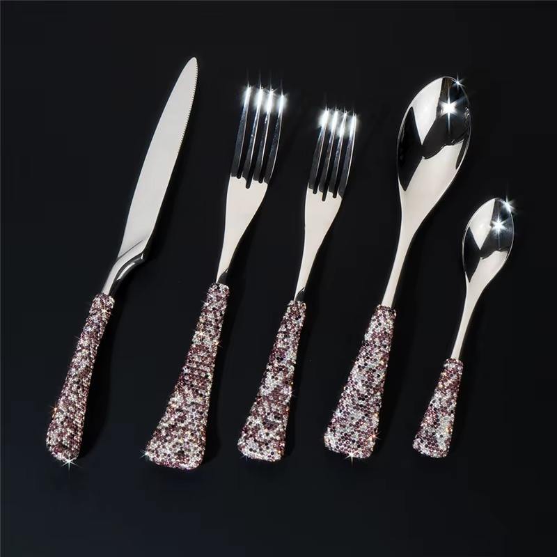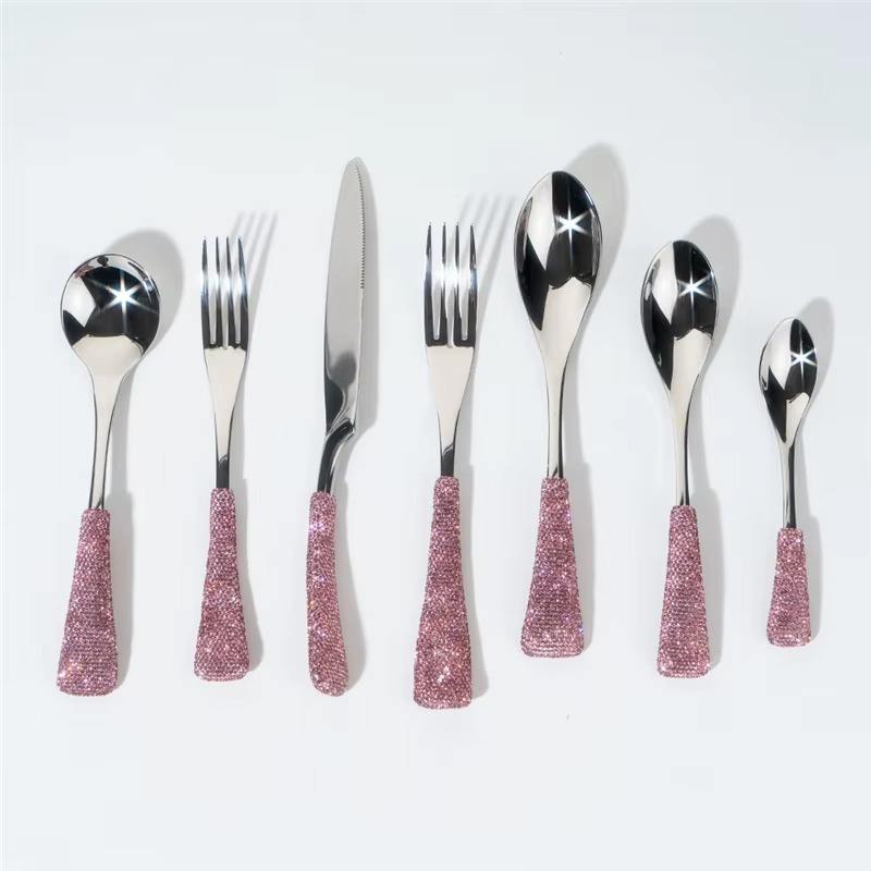 ชุดช้อนส้อมสีเงินพร้อมด้ามจับกลิตเตอร์สีชมพู สำหรับโต๊ะอาหารในครัว ชุดช้อนส้อมหรูหราสำหรับใช้ในชีวิตประจำวัน โอกาสพิเศษ และเป็นของขวัญ