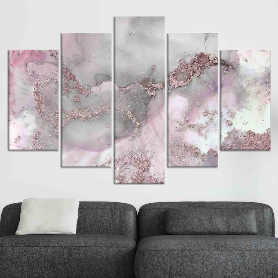 ภาพพิมพ์บนผ้าใบลายหินอ่อนสีชมพูและสีเทา: ภาพพิมพ์บนแก้วด้วยหมึกแอลกอฮอล์แบบมันวาว ชุดผ้าใบ 5 ชิ้นแบบผสม