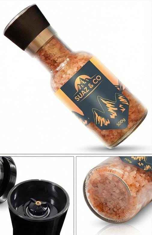 เกลือหิมาลายันสีชมพูในเครื่องบดแก้วขนาดใหญ่ปรับได้ 500 กรัม แบบเติมได้สำหรับปรุงรสในครัว