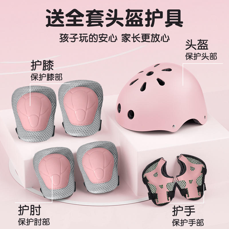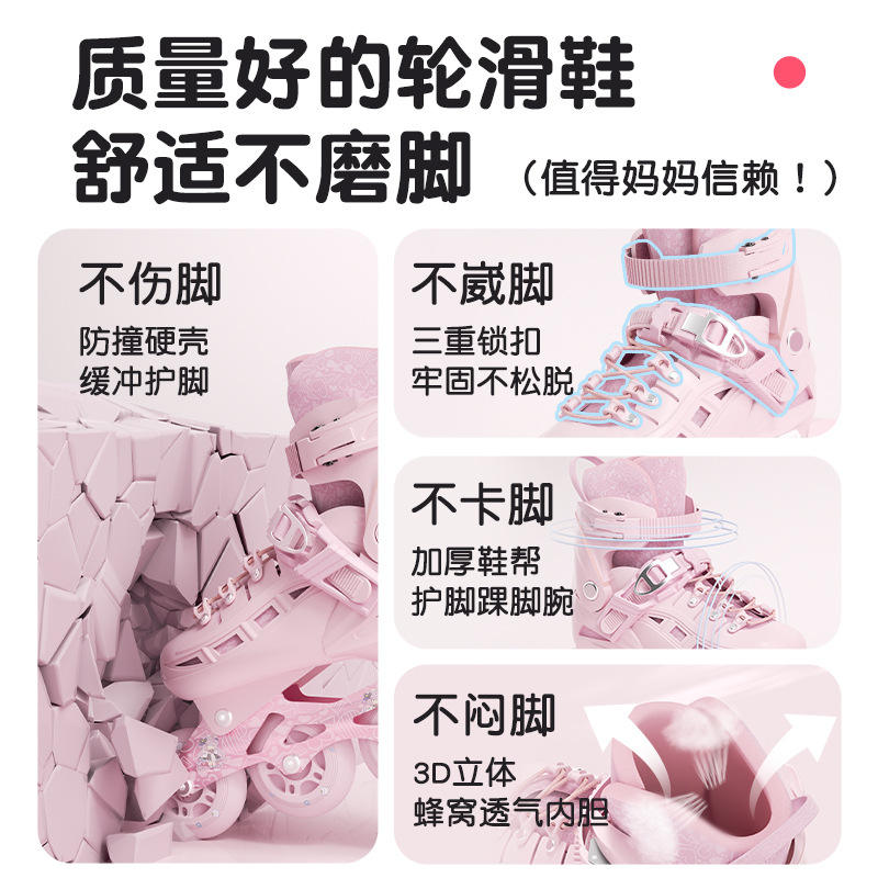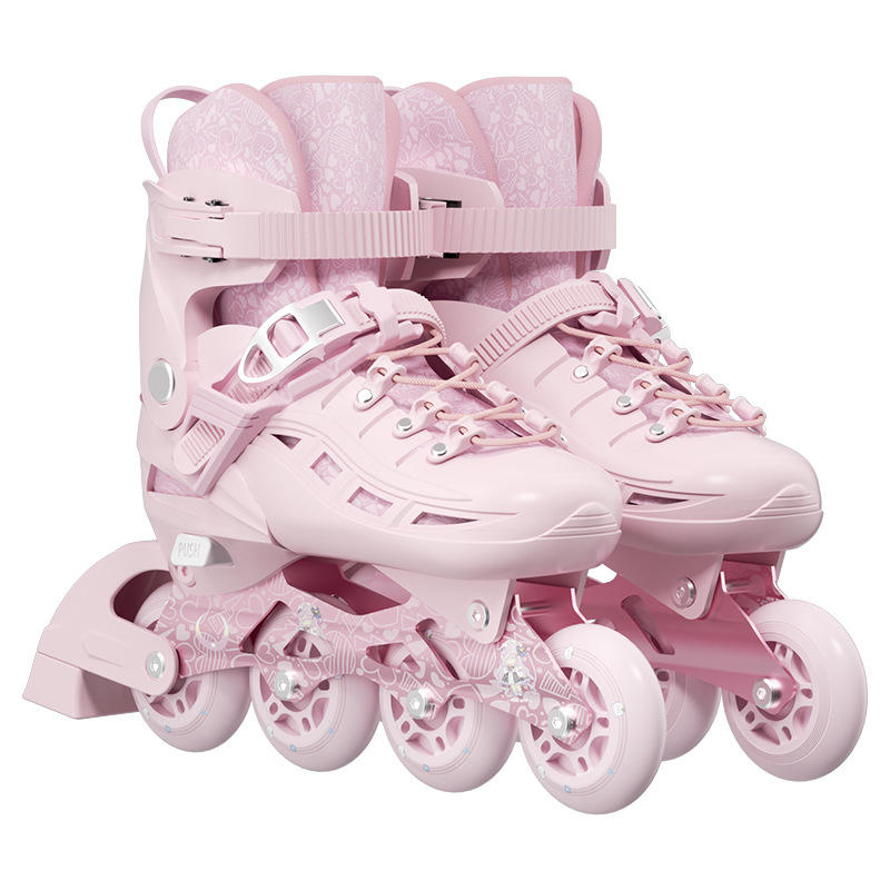รองเท้าสเก็ตแบบอินไลน์สีชมพูสำหรับเด็ก ไซส์ S M L พร้อมเบรกและล้อสี่ล้อ พื้นรองเท้า TPR บุผ้าพลัฌ