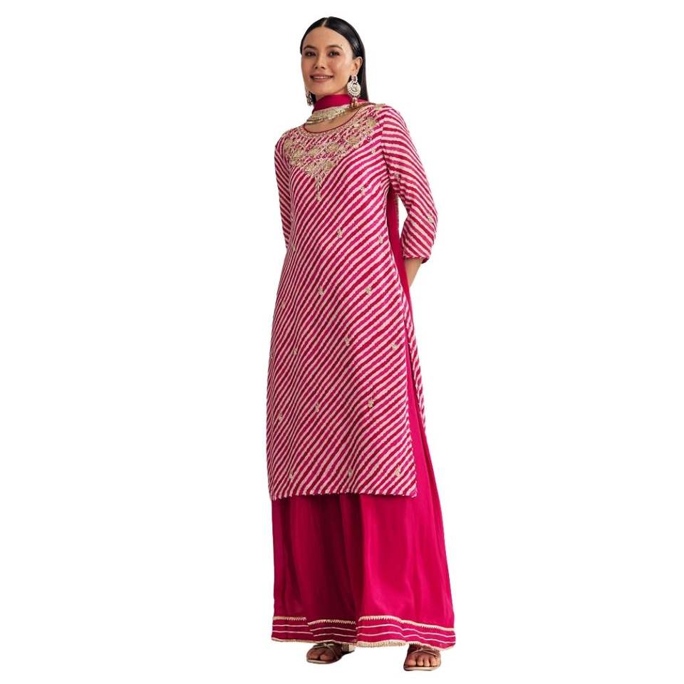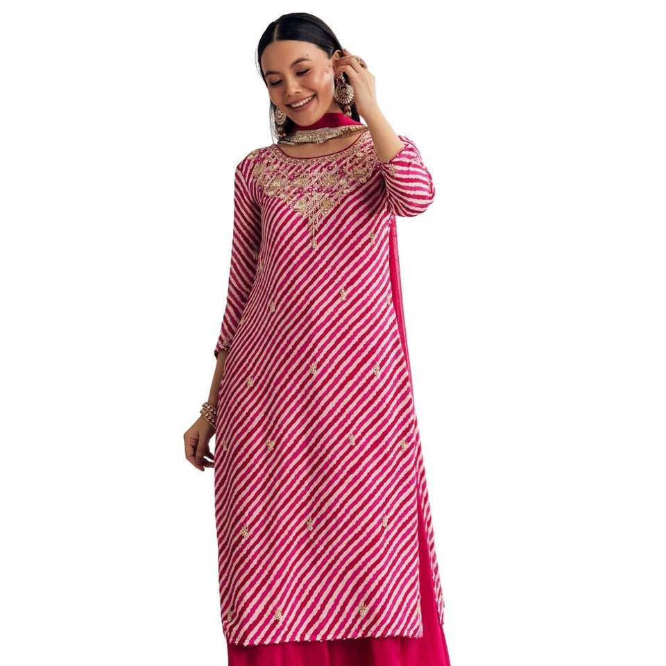 ชุดสูทสีชมพู leheriya zardosi ทำงานชุดเกอร์ตาพาลาซโซสำหรับผู้หญิงเสื้อผ้าแนวพื้นเมืองออกแบบได้ตามต้องการ