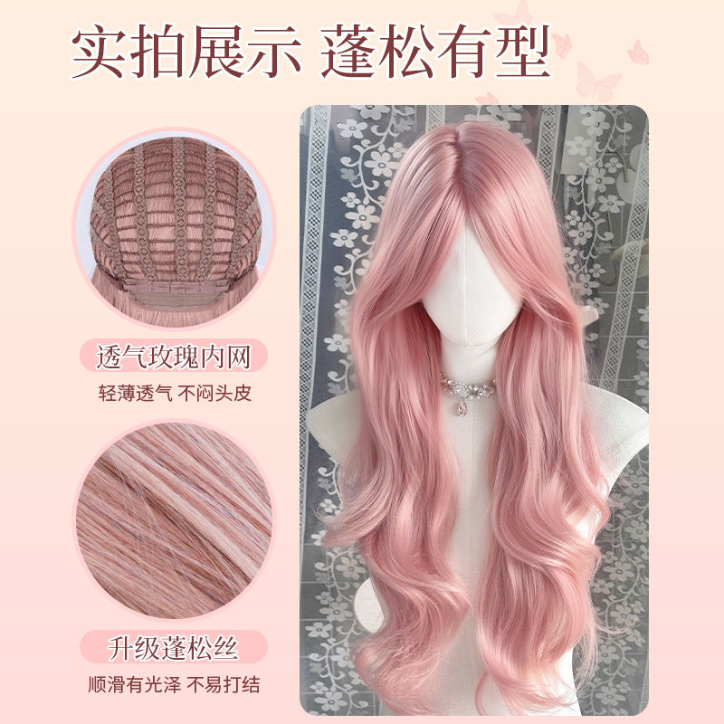 วิกผมยาวสีชมพูแบบลอน พร้อมหน้าม้าปัดข้าง ไลน์ผมธรรมชาติ วิกเต็มศีรษะสำหรับผู้หญิง สีชมพูพีชสไตล์เกาหลี ยาว 75 ซม. ทำจากเส้นใยทนความร้อนสูง