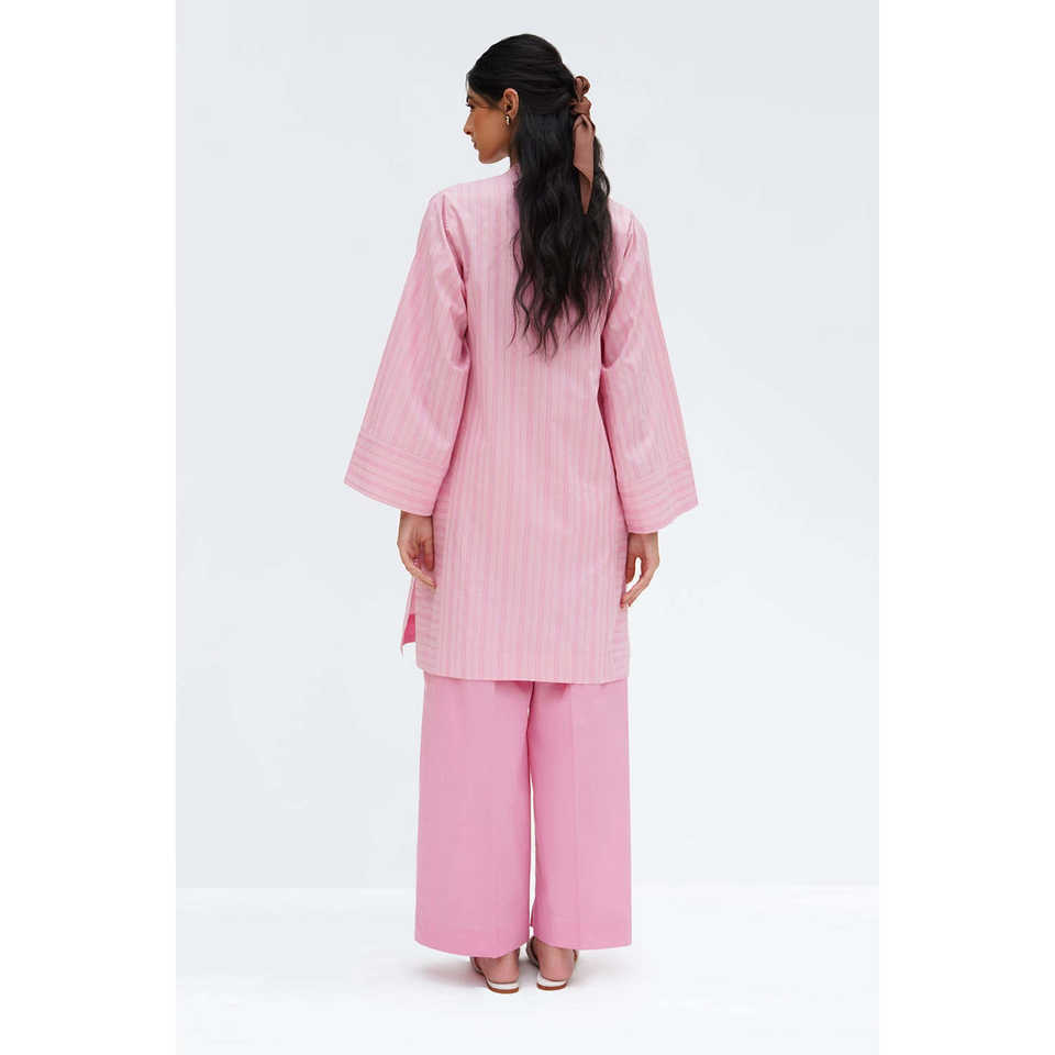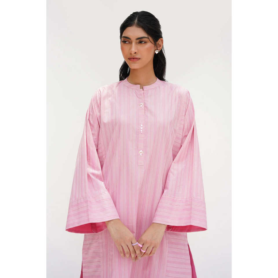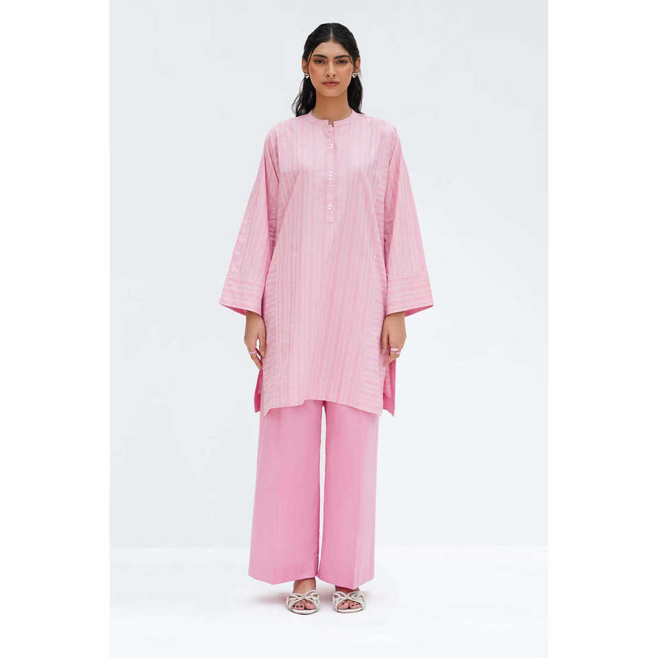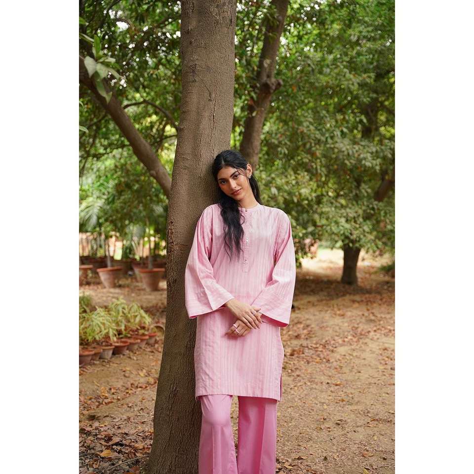 ชุดเซ็ตผู้หญิงประดับด้วยผ้าลูเร็กซ์สีชมพู เสื้อผ้าฝ้ายโมดอล กางเกงขายาวประดับเลื่อม แขนสามส่วน เสื้อทอทรงยาว กางเกงขาสั้น ทรงหลวม
