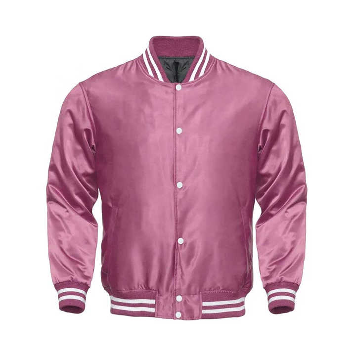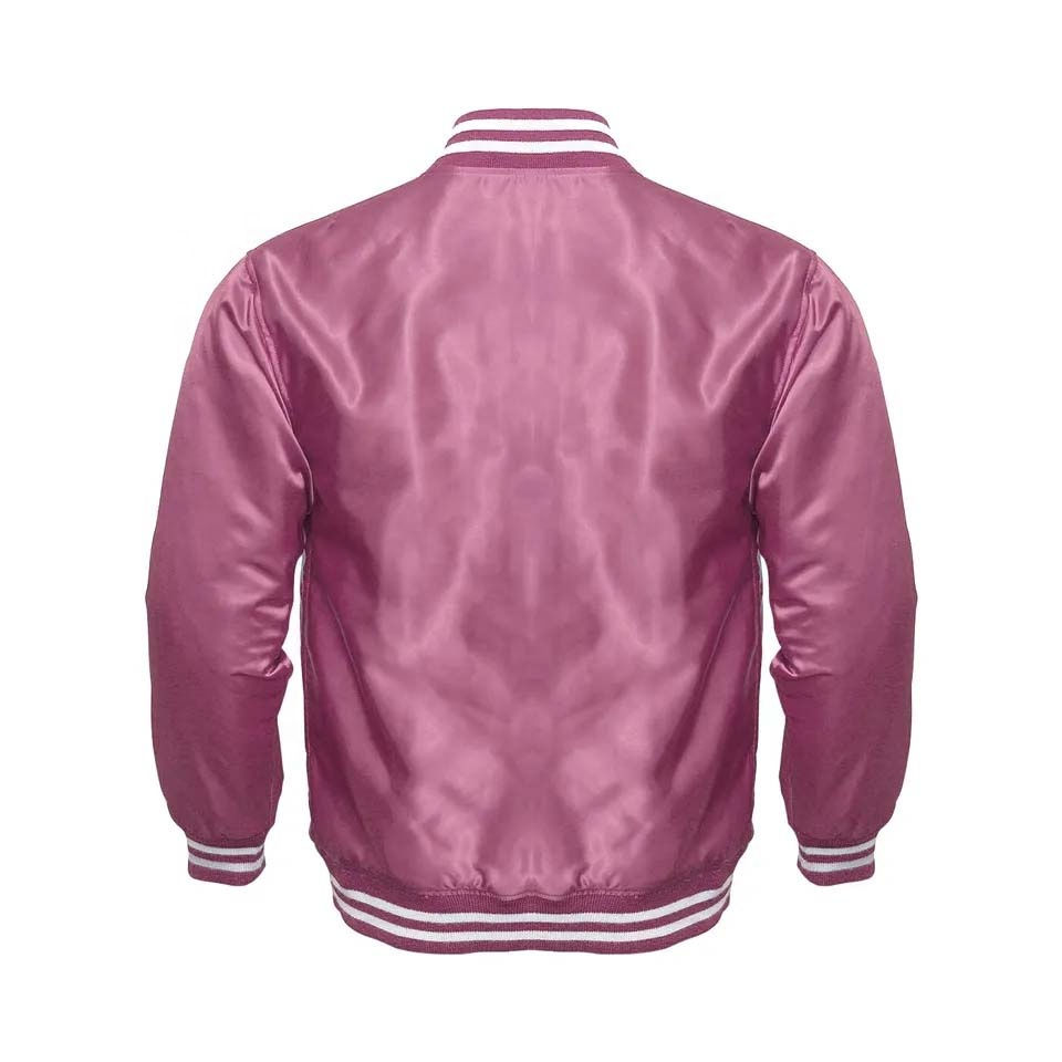 แจ็คเก็ตวาร์ซิตี้สีชมพูอมแดง ผ้าซาติน แบรนด์ไฮสตรีท แบบ Letterman สำหรับวิทยาลัย คุณภาพพรีเมียม หนังแท้ ใช้ได้ในฤดูหนาว