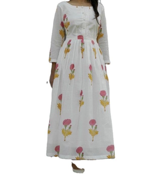 ชุดเดรสลำลองสำหรับผู้หญิงผ้าคอตตอนแบบปิดคอสำหรับผู้หญิงกางเกงยีนส์ผ้าพิมพ์ลายแบบปิดคอสีชมพู