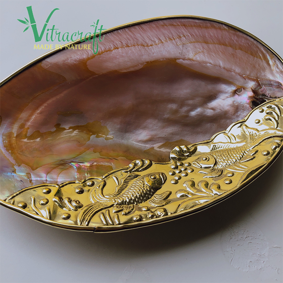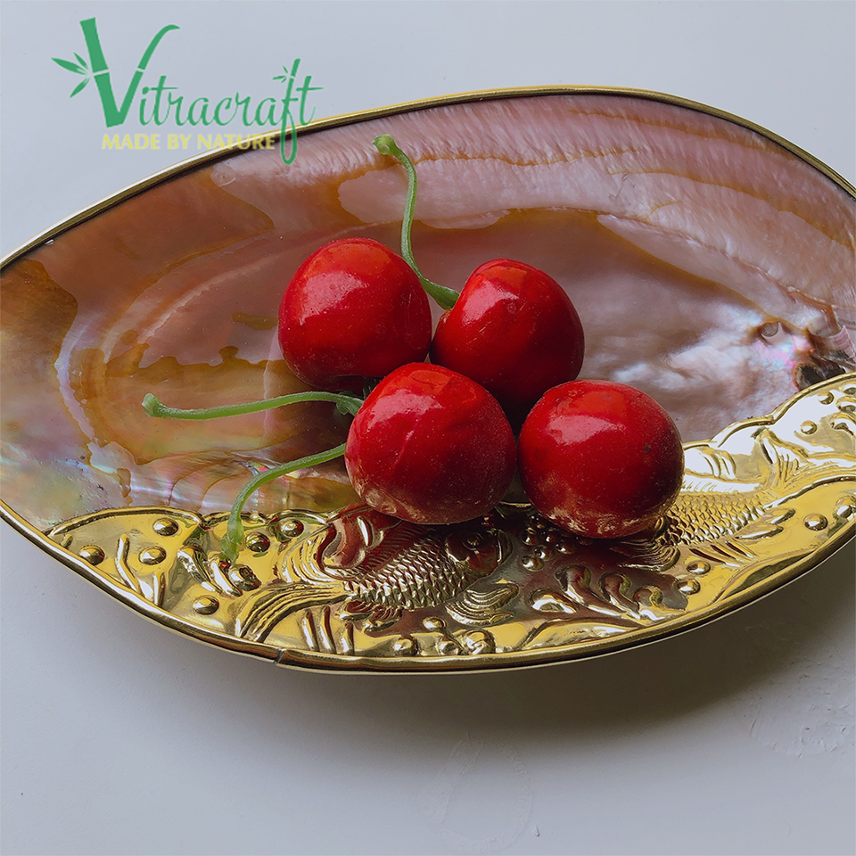 แผ่นมุกสีชมพูฝังด้วยลวดลายโลหะทองแดงที่เป็นเอกลักษณ์สำหรับอาหารและผลไม้จานที่เหมาะสมสำหรับคาเวียร์ที่มีราคาแพง