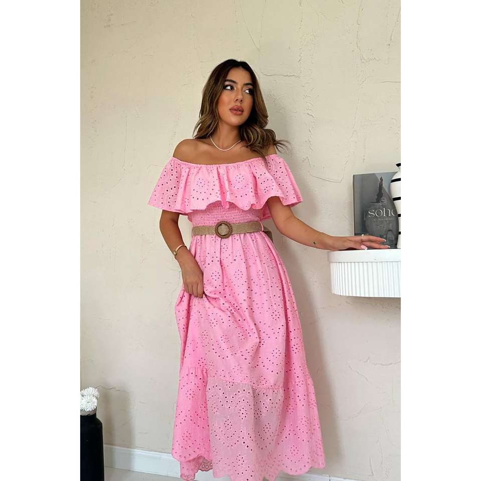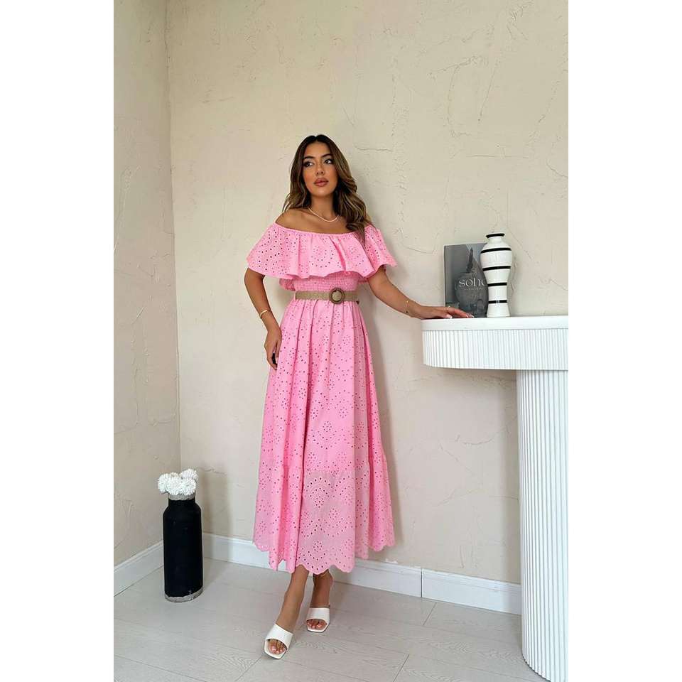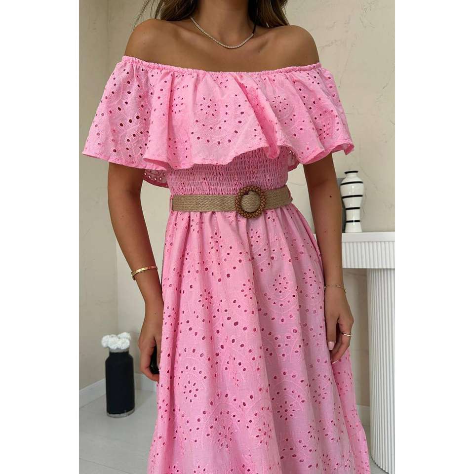 เดรสสีชมพูแบบเปิดไหล่ปักลาย ความยาวปานกลาง เอวสม็อค ทรงเอ ผ้าทอ ระบายอากาศได้ดี สไตล์ลำลอง