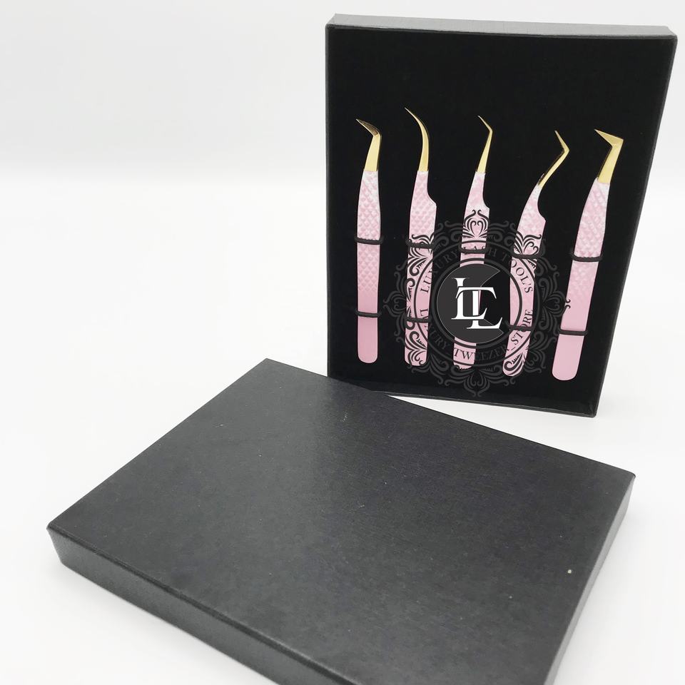 แหนบต่อขนตาปลอมทำจากสแตนเลสเคลือบผงสีชมพูกล่องใส่การ์ดสีดำ