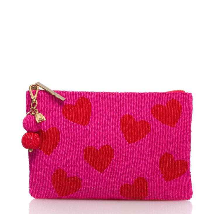 กระเป๋าใส่เหรียญรูปหัวใจสีชมพูแดงประดับลูกปัด กระเป๋าเครื่องสำอางลูกปัดแก้ว กระเป๋าใส่ของใช้ส่วนตัวขนาดเล็กสำหรับผู้หญิง กระเป๋าใส่เครื่องสำอางสำหรับเดินทาง ของขวัญวาเลนไทน์ กระเป๋าถือ