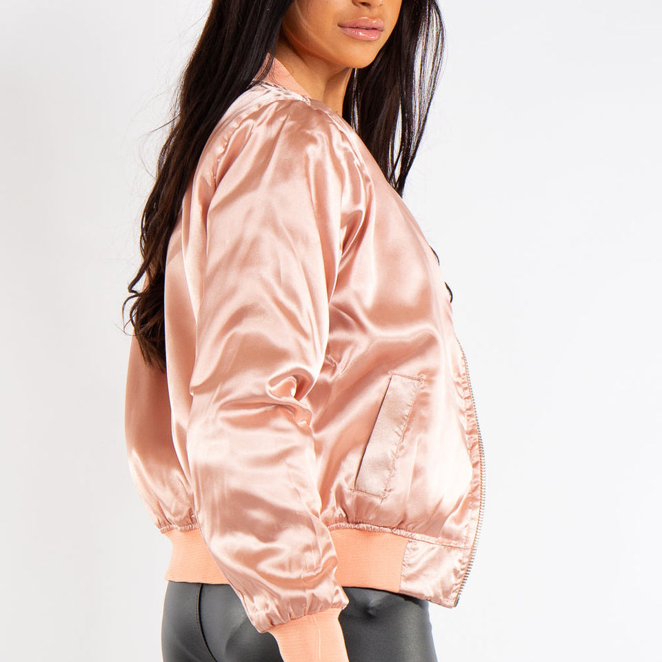แจ็กเก็ตเบสบอลผู้หญิงสไตล์ย้อนยุคผ้าซาตินสีชมพูน้ำหนักเบาเงางามนุ่มสบาย