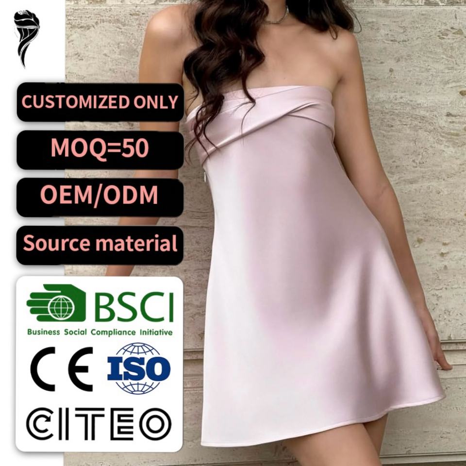 เดรสสั้นผ้าซาตินสีชมพูแบบผูกเชือกด้านหลัง ทรงเอไลน์ ไม่มีสายคล้องไหล่ สำหรับผู้หญิง