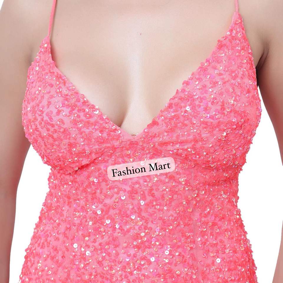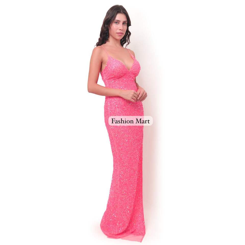 ชุดราตรีปักเลื่อมสีชมพูสำหรับผู้หญิงเดรสทรงสลิมฟิตคอวีแขนกุดมีร่องด้านหน้า