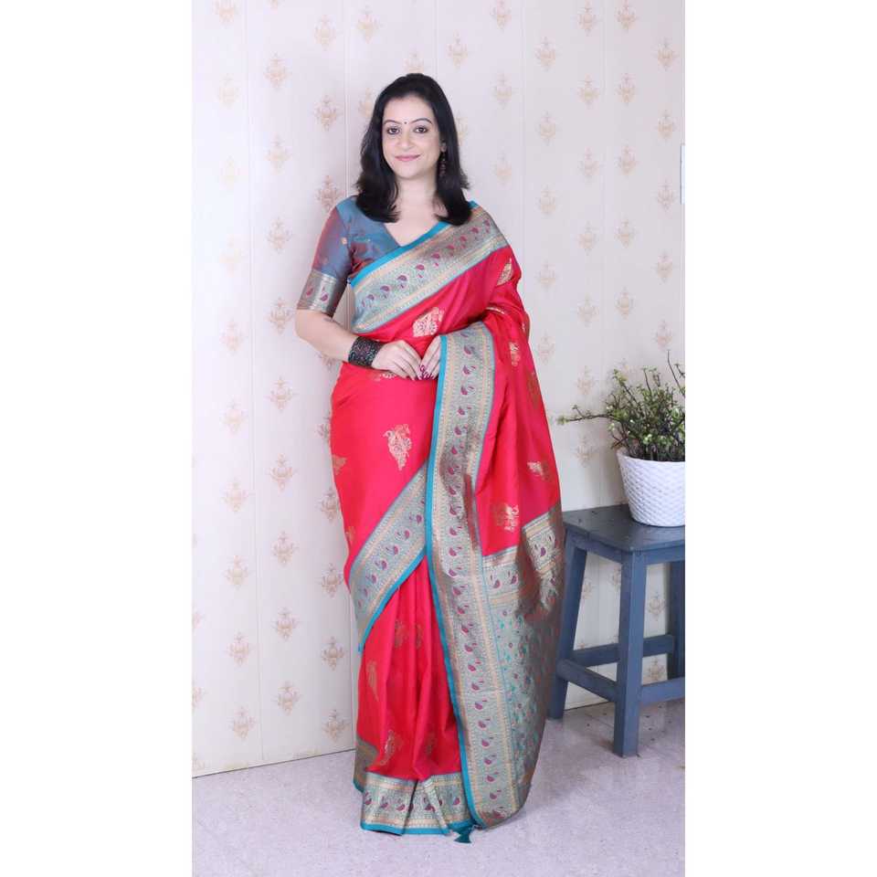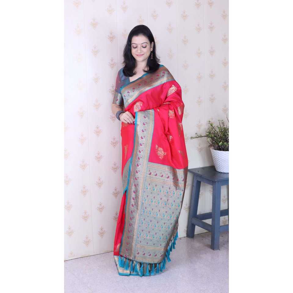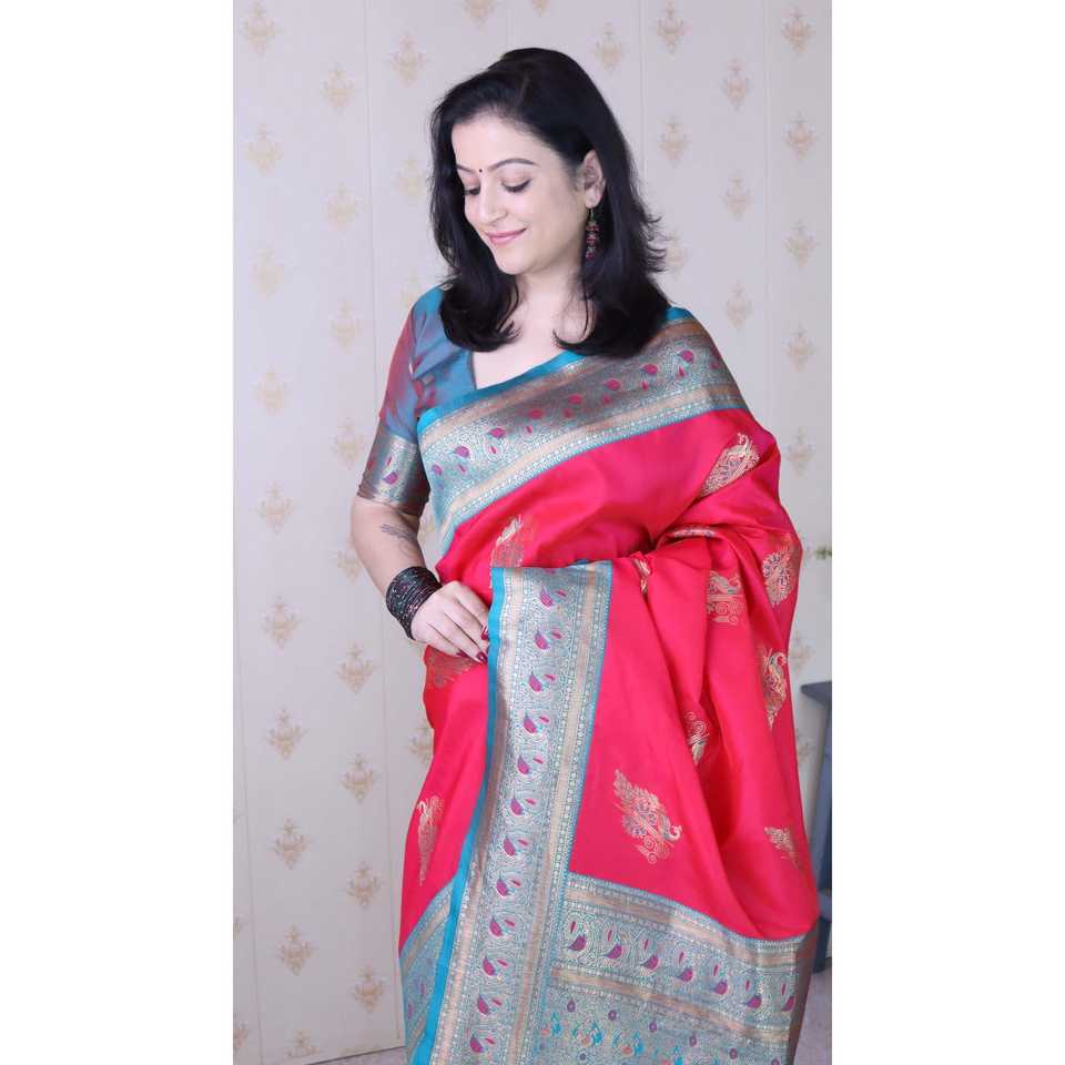 ผ้าไหมพิมพ์ลายพาวน์ค็อกซ์สีชมพูอ่อน แบรนด์ Elite Weaves รุ่น Banarasi Zari น้ำหนัก 650 กรัม พร้อมส่ง
