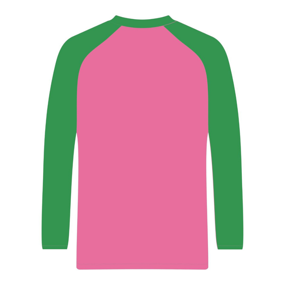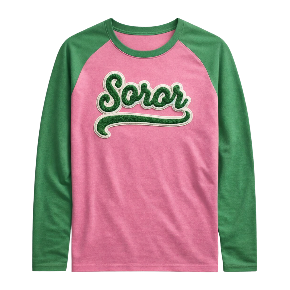 เสื้อยืดแขนสั้นสีชมพูแบบ Raglan สำหรับชมรมนักศึกษาหญิง ลายกรีก สีชมพู-เขียว สำหรับนักศึกษาหญิง แฟชั่นฤดูร้อน เป็นมิตรกับสิ่งแวดล้อม