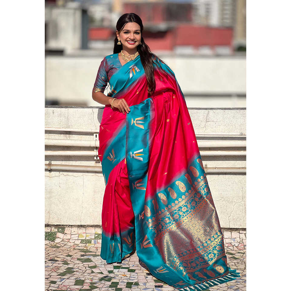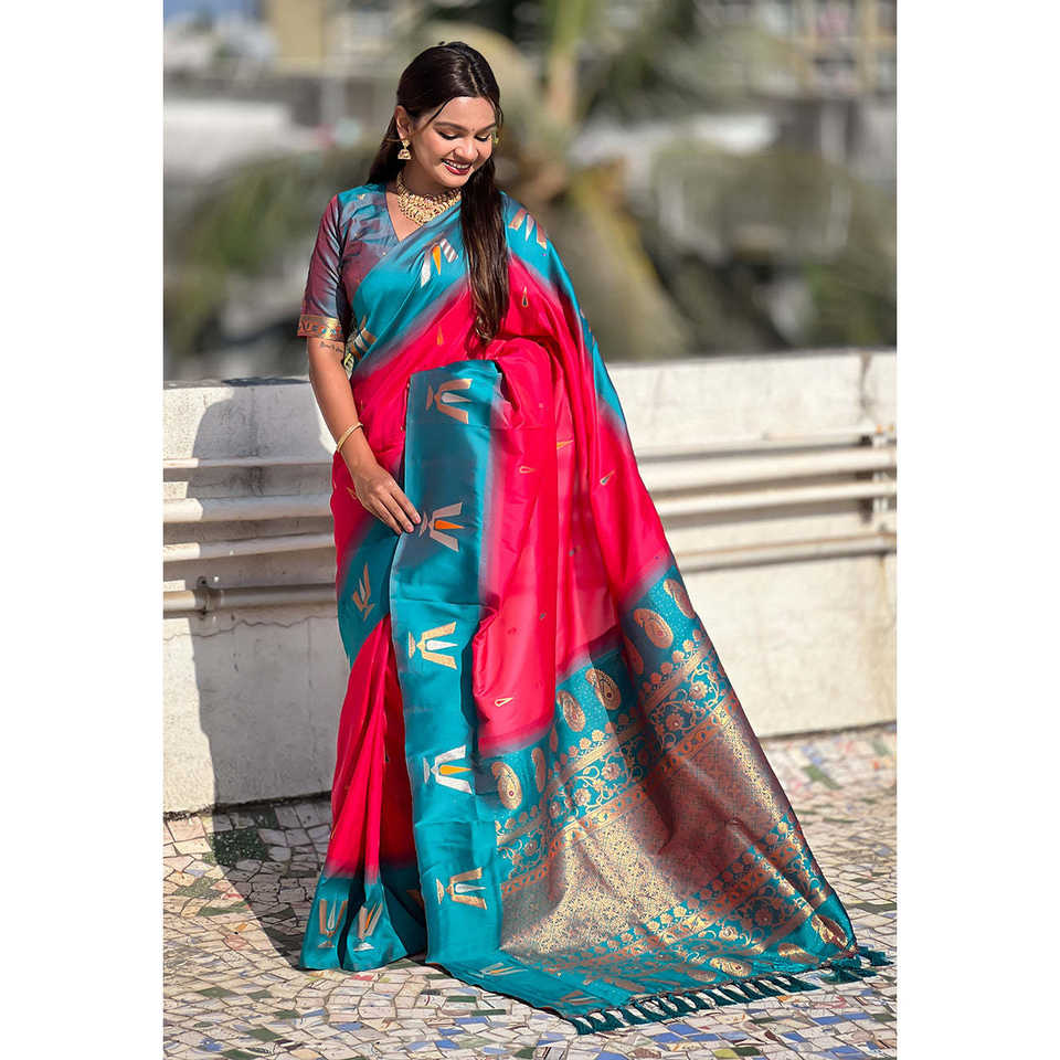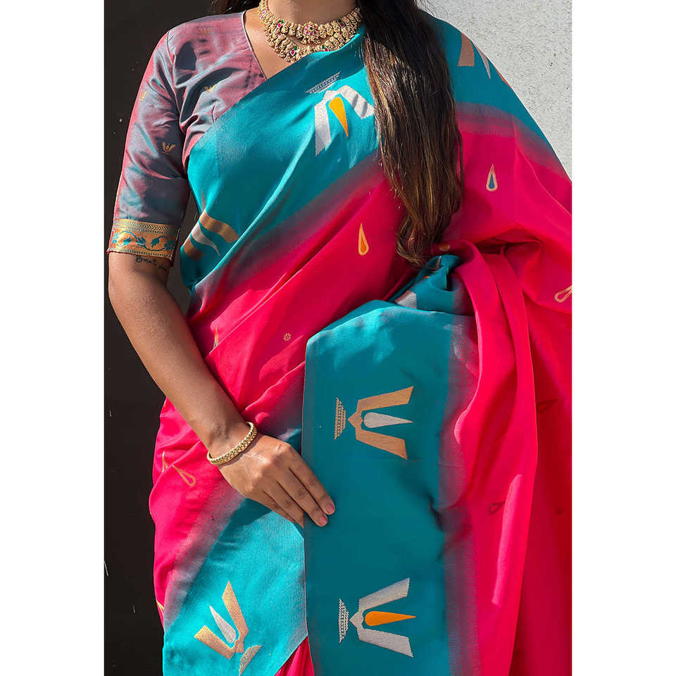 ผ้าซารีสีชมพูแบบดั้งเดิมของภาคใต้ ลายติลัก ตัดกับผ้าไหมเนื้อนุ่มทอแบบซารี หรูหรา สำหรับงานแต่งงานทุกฤดูกาล