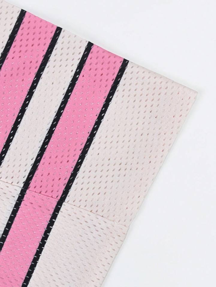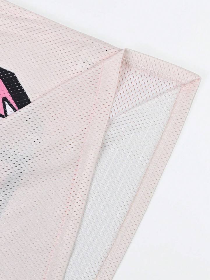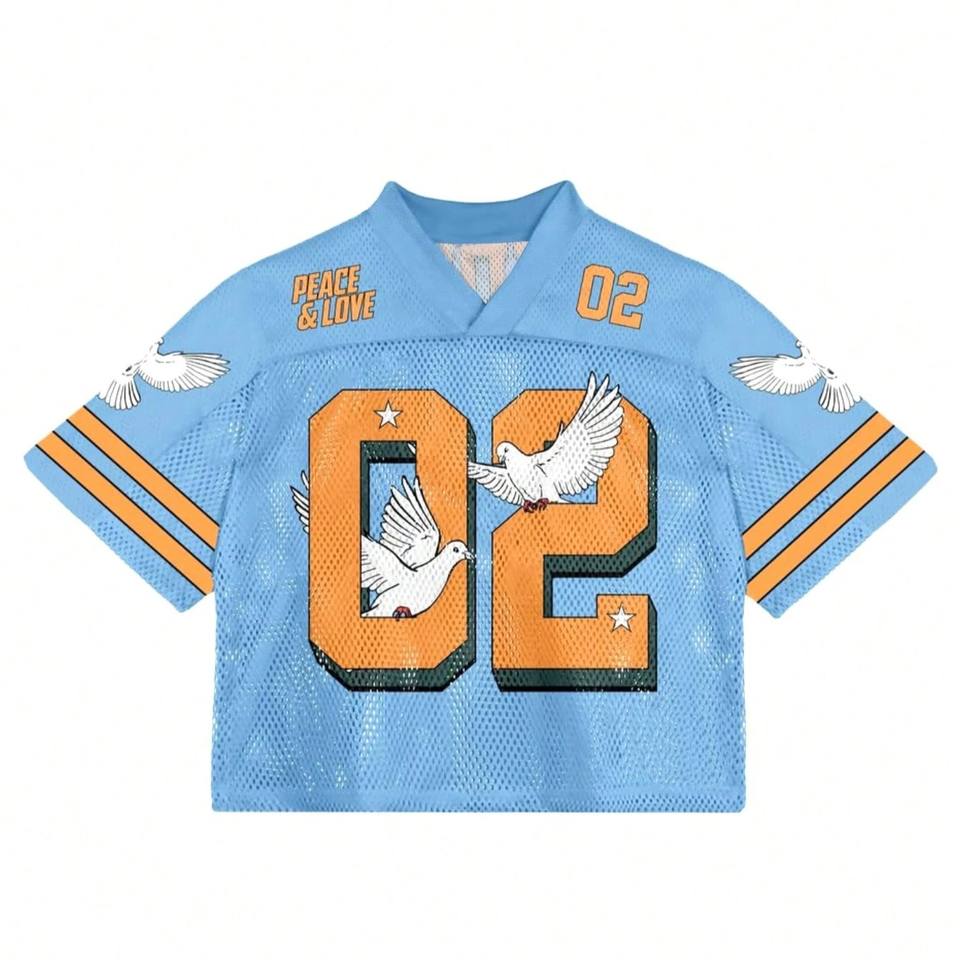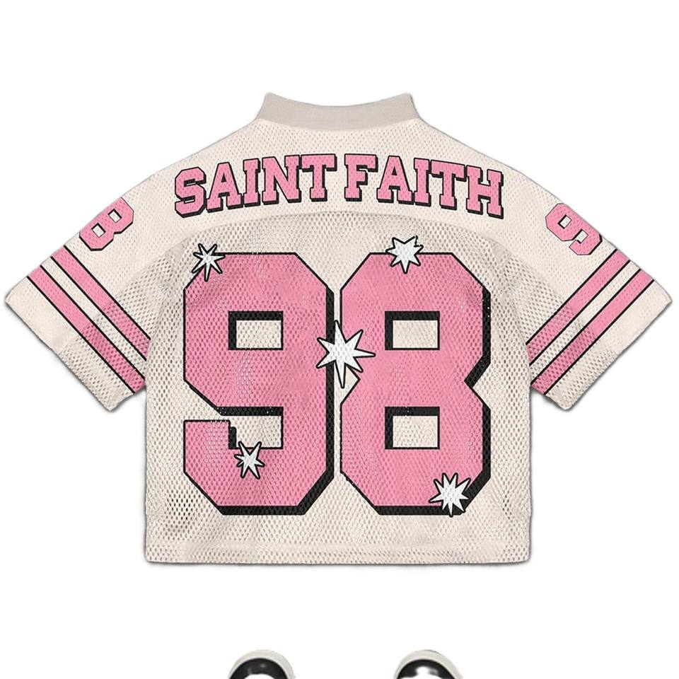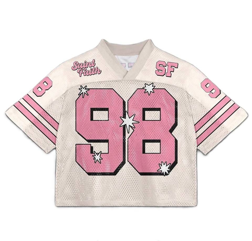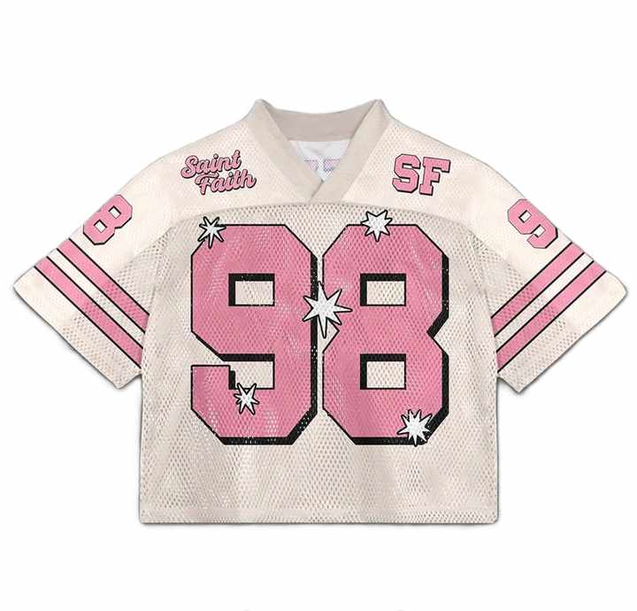 เสื้อเจอร์ซีย์อเมริกันฟุตบอลสีชมพูพิมพ์ลายกราฟิกตาข่าย ทรงครอป โอเวอร์ไซส์ คอวี สำหรับผู้หญิง สไตล์สตรีทแวร์ แบบซับลิเมชั่น รับผลิตแบบ OEM จำนวนมาก