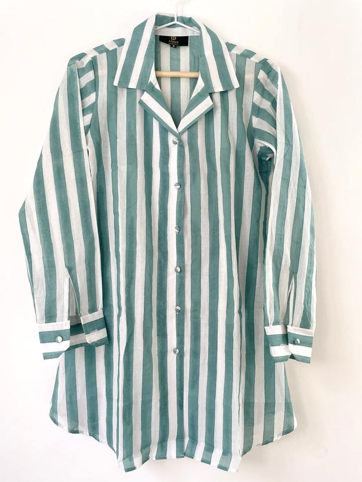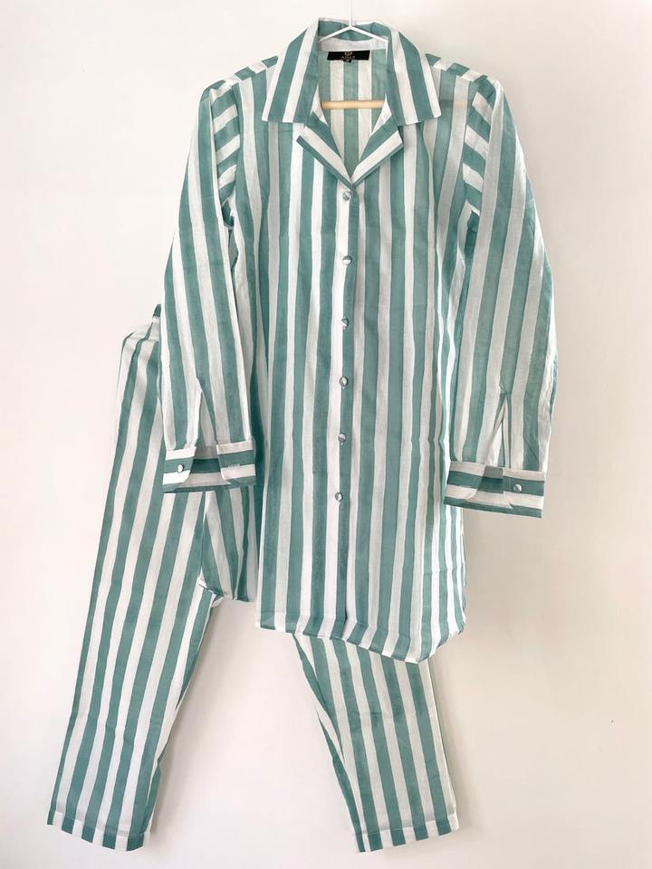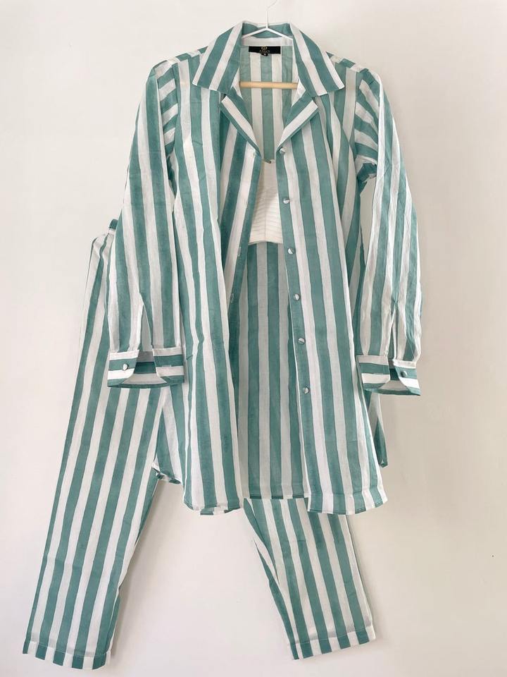 ชุดเซ็ตเสื้อผ้าลายทางสีชมพู สไตล์ลำลองสำหรับผู้หญิง คอปกปิด ผ้าฝ้าย ผลิตและส่งออกจากอินเดีย