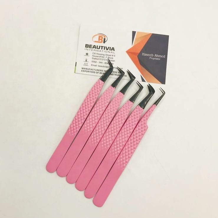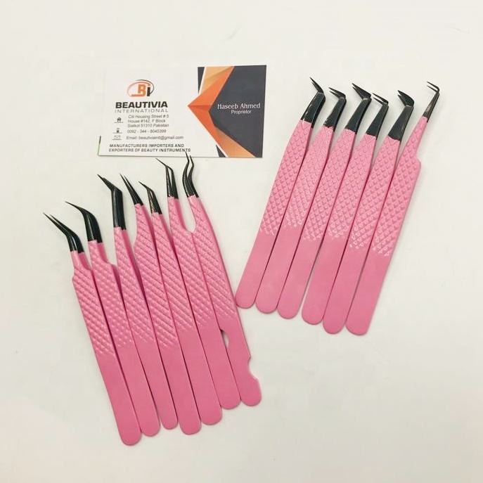 แหนบขนตาสแตนเลสสีชมพูแบบมืออาชีพพร้อมปลายพลาสมาสีดำเครื่องมือต่อขนตาอย่างยั่งยืน