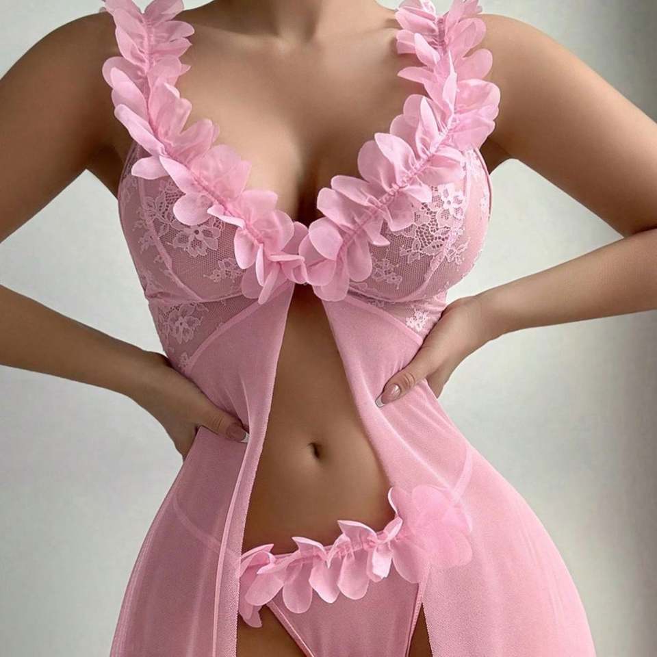 ชุดราตรีเจ้าหญิงสีชมพูหวานผ้าตาข่ายลูกไม้ซีดเซสคอวีเปิดด้านหน้าชุดแมกซี่รักชุดเดรสยาวหนึ่งชิ้น