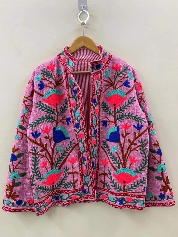Suzani เสื้อนอกปักลายดอกไม้สีชมพู