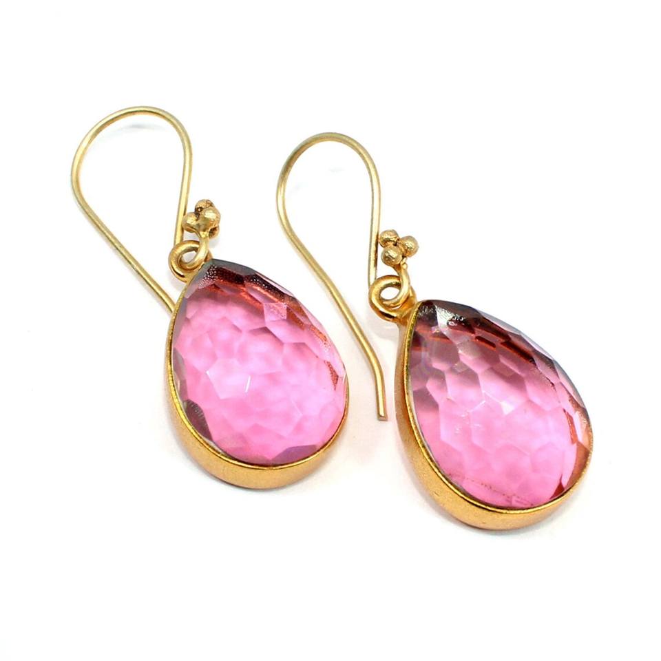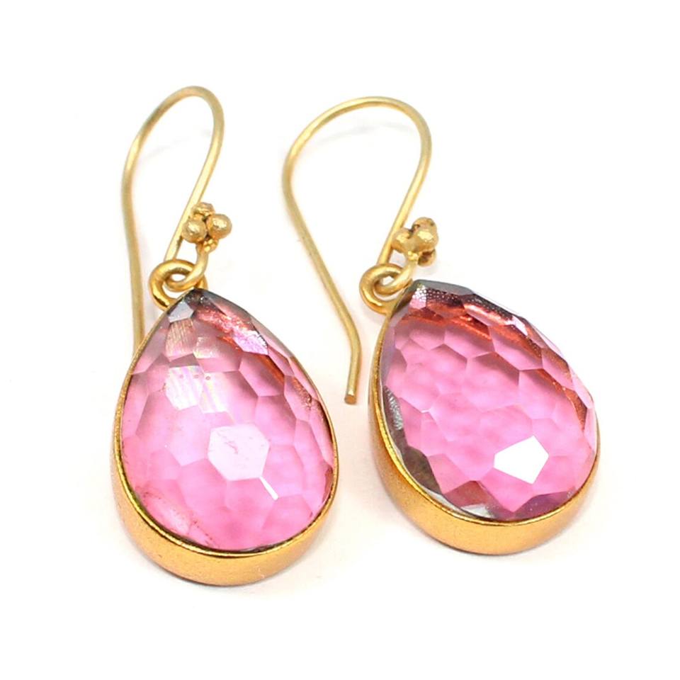 ต่างหูเงินแท้ 925 ชุบทองวินเทจ ประดับพลอยทัวร์มาลีนสีชมพูทรงหยดน้ำ ฝังแบบ Bezel Setting งานแฮนด์เมด ของขวัญ