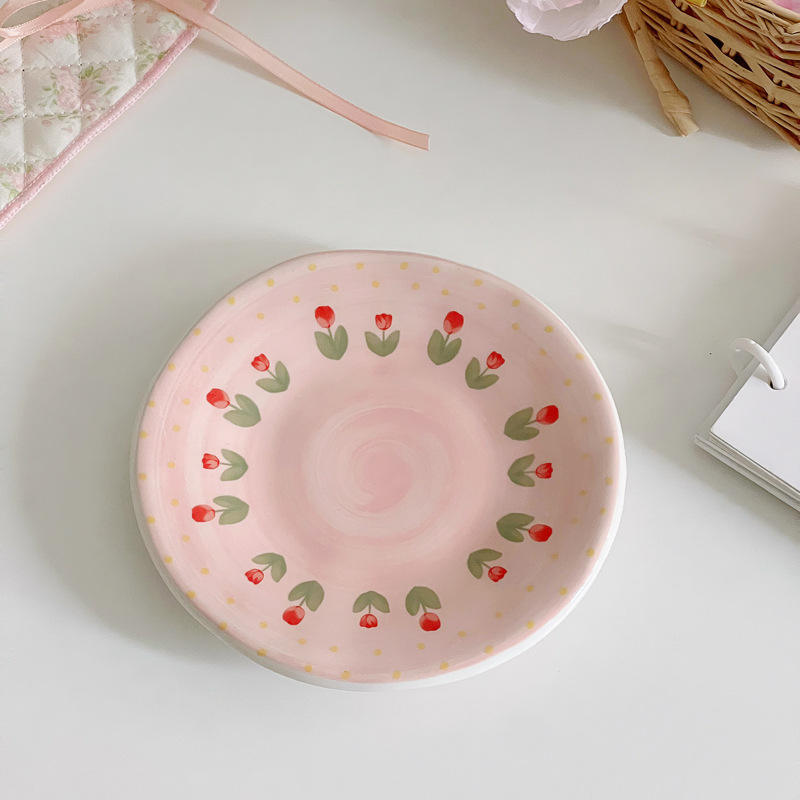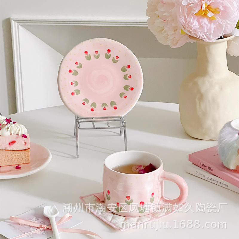 แก้วกาแฟเซรามิกลายดอกทิวลิปสีชมพู งานปั้นมือ ดีไซน์สวยงามระดับพรีเมียม แก้วเซรามิคสำหรับใช้ในบ้าน