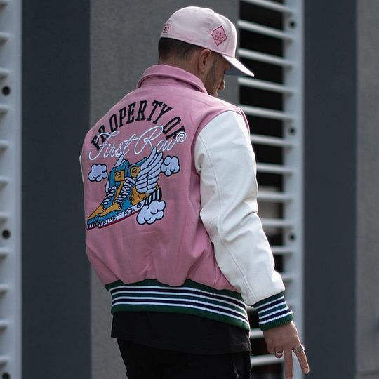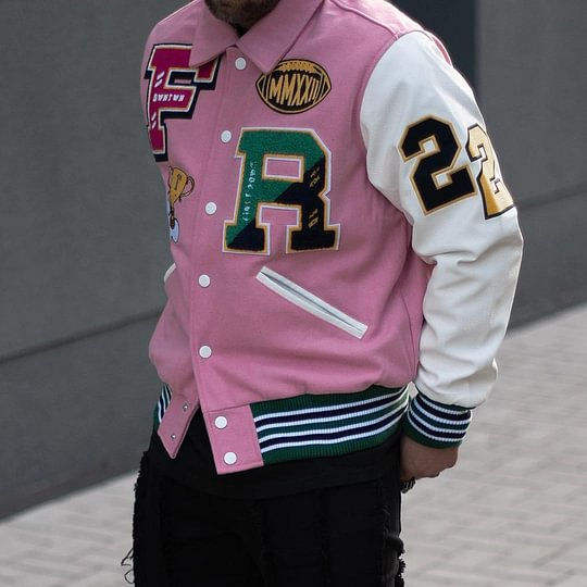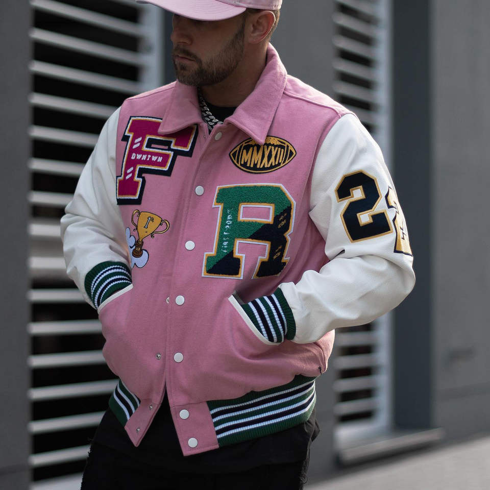 เสื้อแจ็กเก็ตเบสบอลสำหรับผู้ชายเสื้อแจ็กเก็ตเบสบอลเลตเทอร์แมนแนวสตรีทปักลายสำหรับผู้ชายเสื้อแจ็กเก็ตมีแขนหนัง
