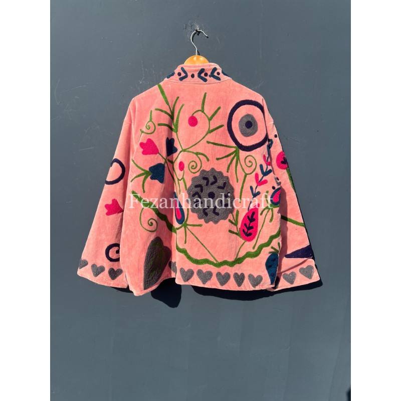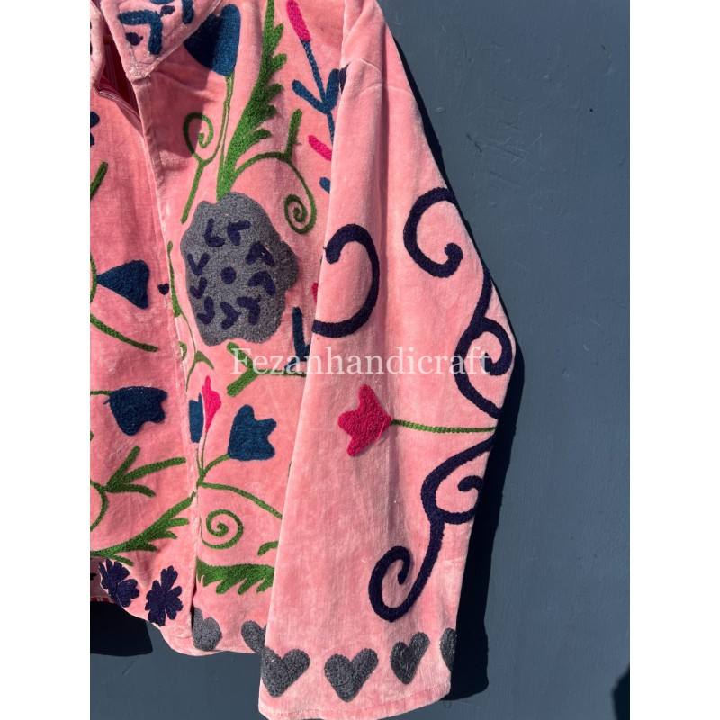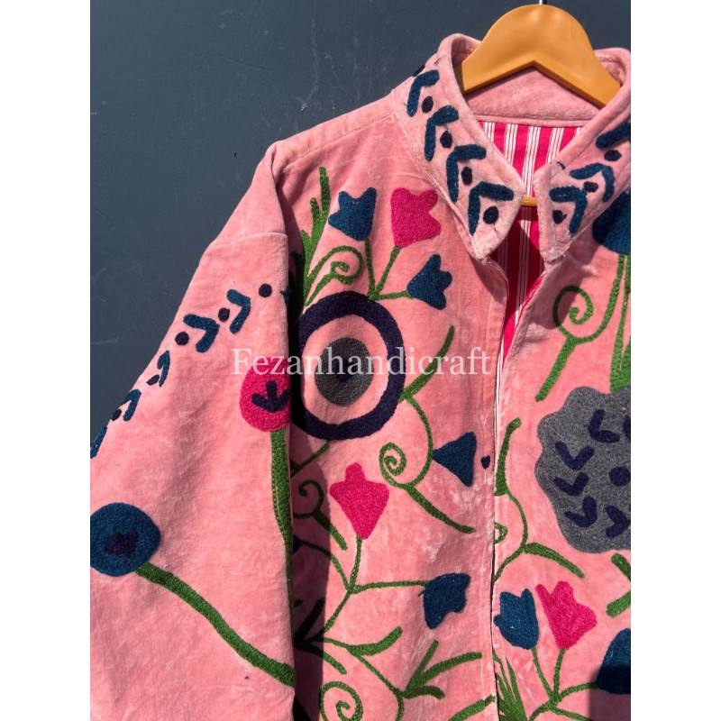เสื้อแจ็คเก็ตกำมะหยี่สีชมพู ปักลายดอกไม้แบบอุซเบก เสื้อโค้ททำมือสำหรับฤดูหนาว เสื้อโค้ทแบบยูนิเซ็กส์ สไตล์โบโฮฮิปปี้ เสื้อคลุมผู้หญิง