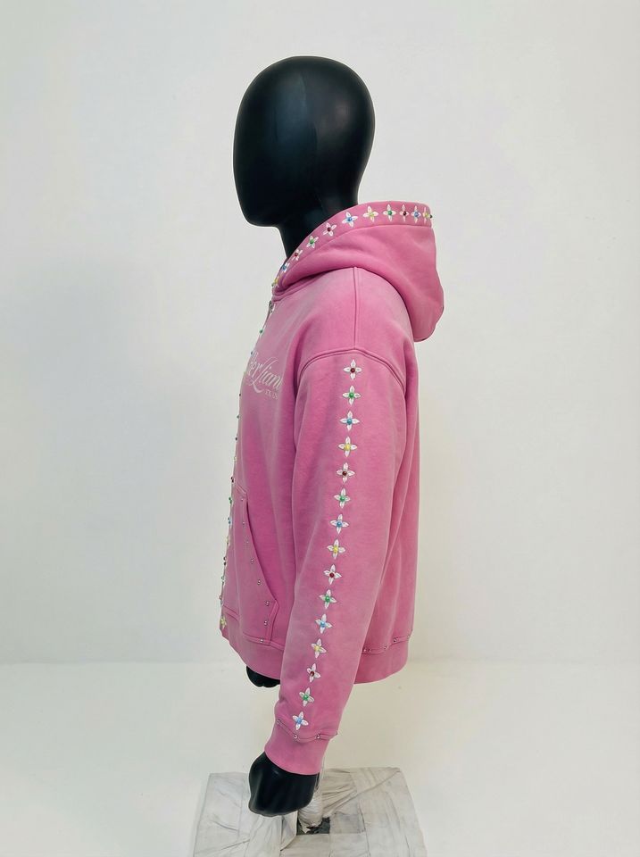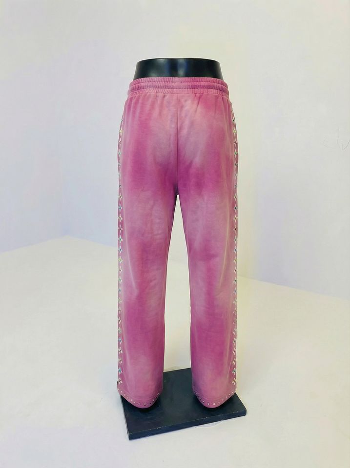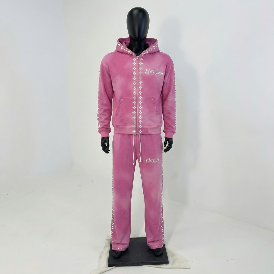 ชุดวอร์มสีชมพูแบบวินเทจ ชุดฮู้ดดี้ประดับหมุดและกางเกงจ็อกเกอร์รูดเชือก ชุดสตรีทแวร์ตกแต่งเข้าชุดกัน รับผลิตแบบ OEM/ODM