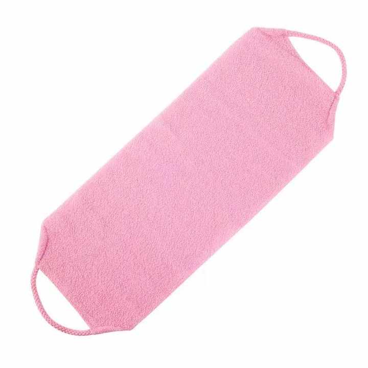 เข็มขัดตาข่ายอาบน้ำสีชมพูแบบยืดได้ผ้าขัดผิวด้านหลังแบบดึงกลับได้ผ้าไม่ก่อให้เกิดอาการแพ้เป็นมิตรกับสิ่งแวดล้อมสำหรับอาบน้ำ