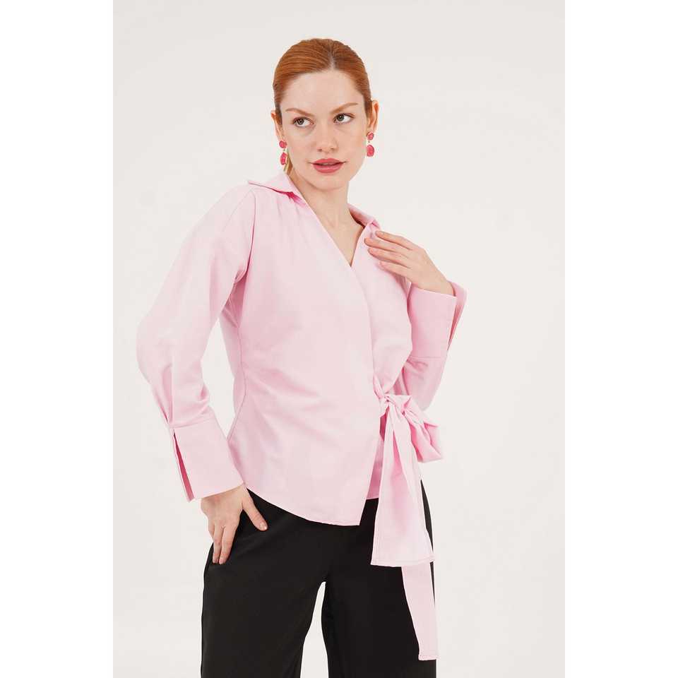 เสื้อเชิ้ตผู้หญิงสีชมพู คอปกผูก แขนยาว ผ้าป๊อปลิน สำหรับใส่ทำงาน พร้อมดีเทลผูกด้านข้าง