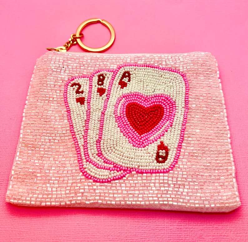 กระเป๋าใส่เหรียญประดับลูกปัดการ์ดสีชมพูและสีแดงพร้อมพวงกุญแจกระเป๋าของขวัญวันวาเลนไทน์