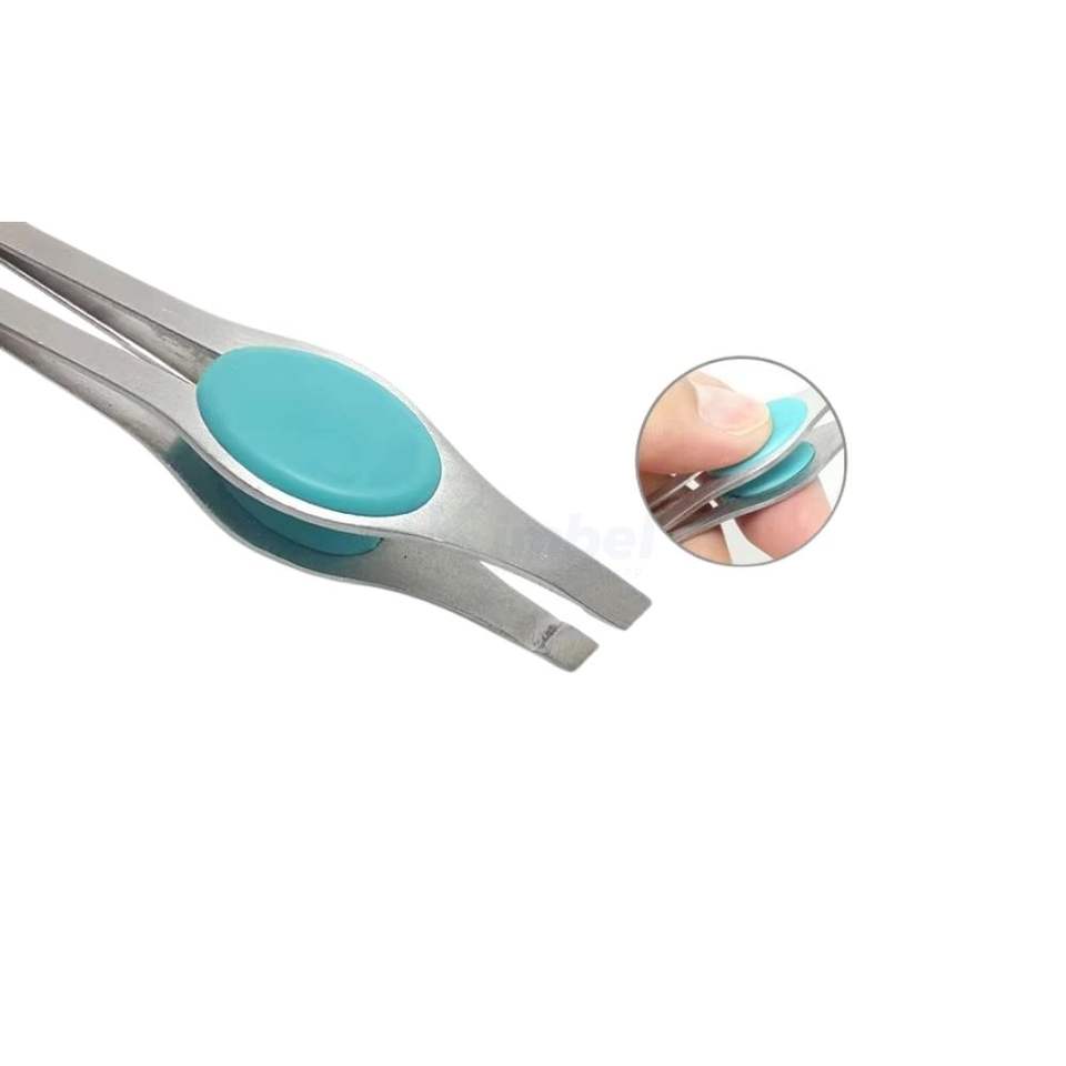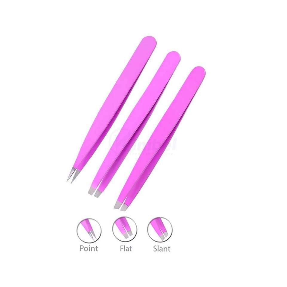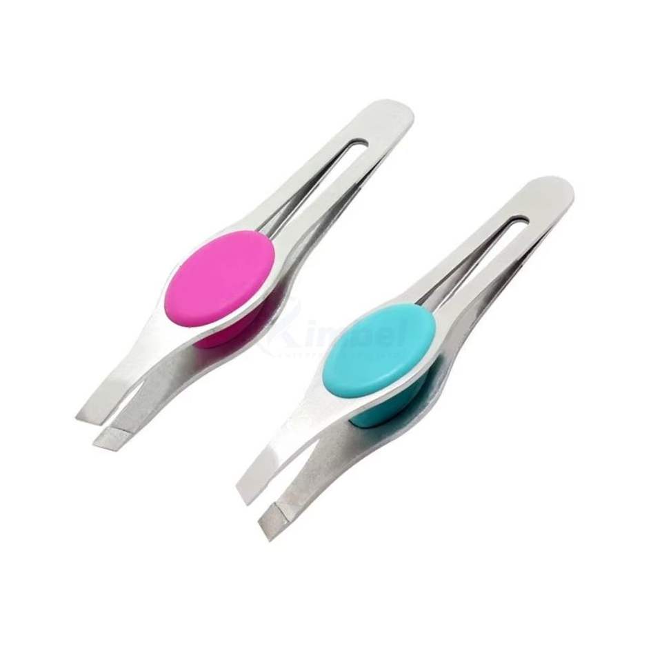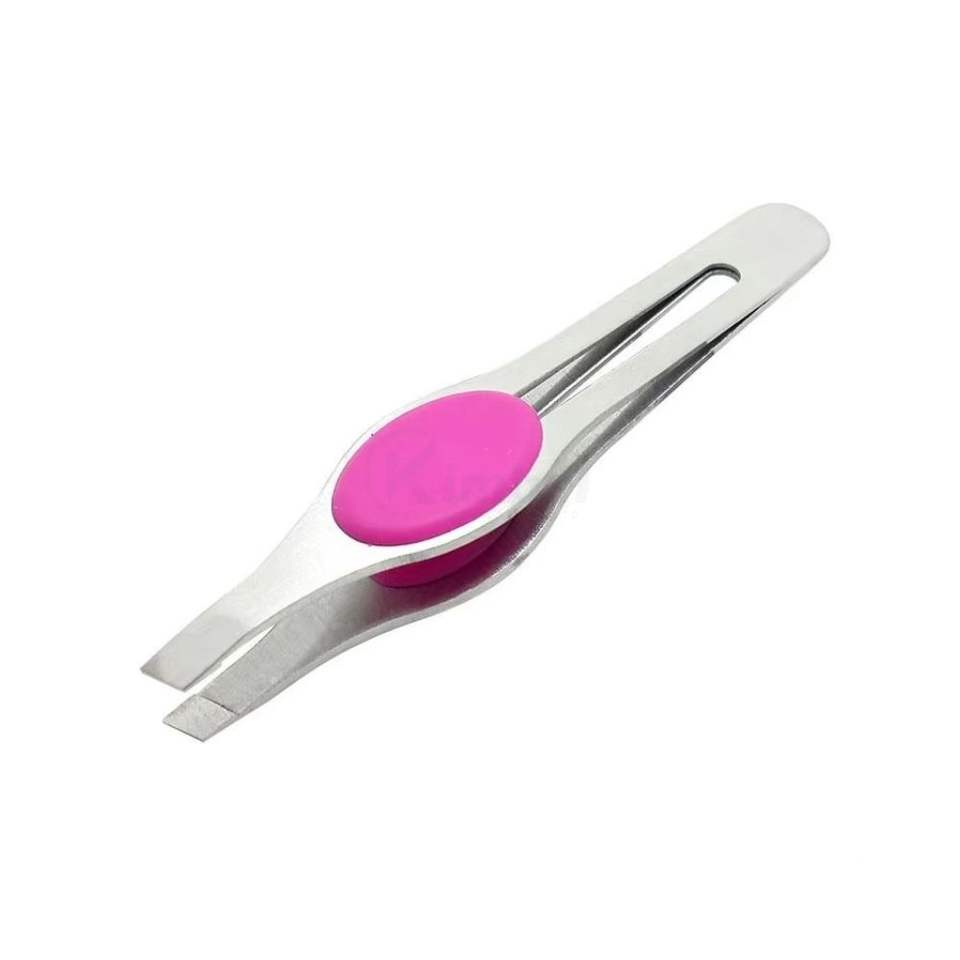 แหนบดึงขนคิ้วปลายเฉียงสีชมพูและสีเงิน ด้ามจับกว้าง ผลิตจากสแตนเลสสตีล คุณภาพสูง รับผลิตแบบ OEM ODM
