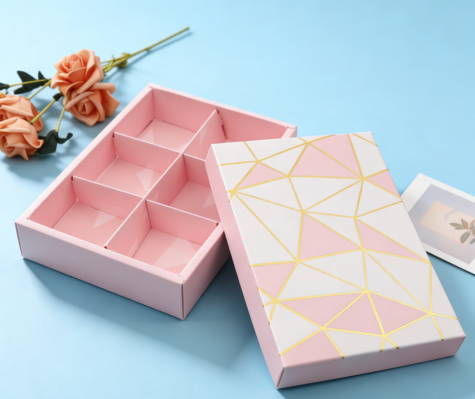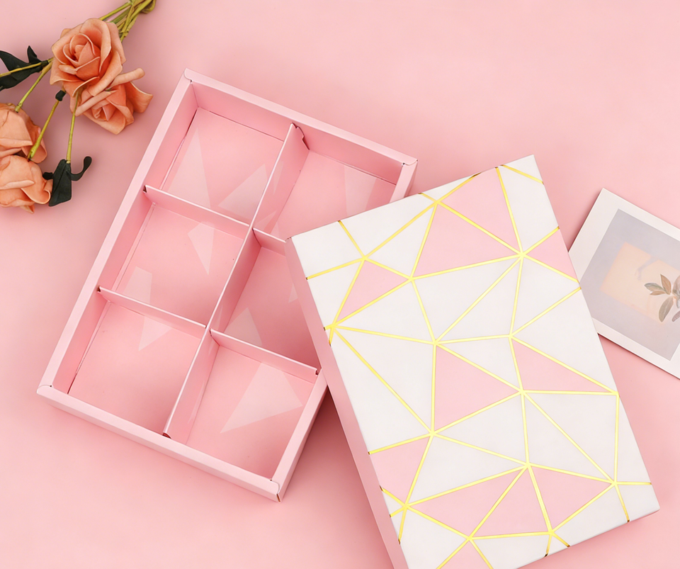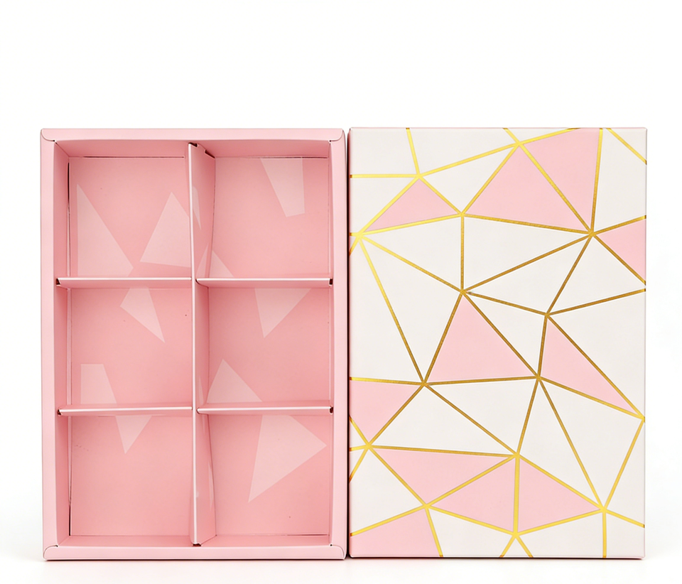 กล่องของขวัญช็อกโกแลต 6 ช่อง ลายเรขาคณิตนูนสีชมพูและสีขาว พร้อมปั๊มทอง ดีไซน์หรูหรา