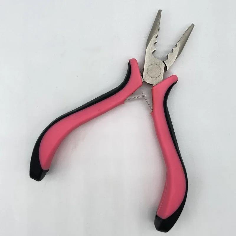 คีมปากตรงเหล็กกล้าคาร์บอนด้ามสีชมพู มี 3 รู สำหรับต่อผมแบบขนนก อุปกรณ์ต่อผม