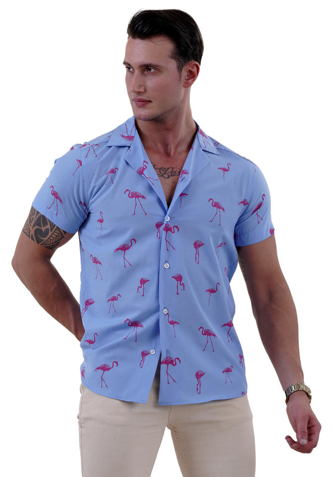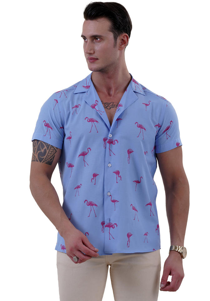 เสื้อฟลามิงโกสีชมพูสำหรับผู้ชายเสื้อเข้าค่ายแขนสั้นฮาวายสีฟ้าผ้าฝ้ายออร์แกนิกระบายอากาศ100% พิมพ์ลายนกน่ารัก