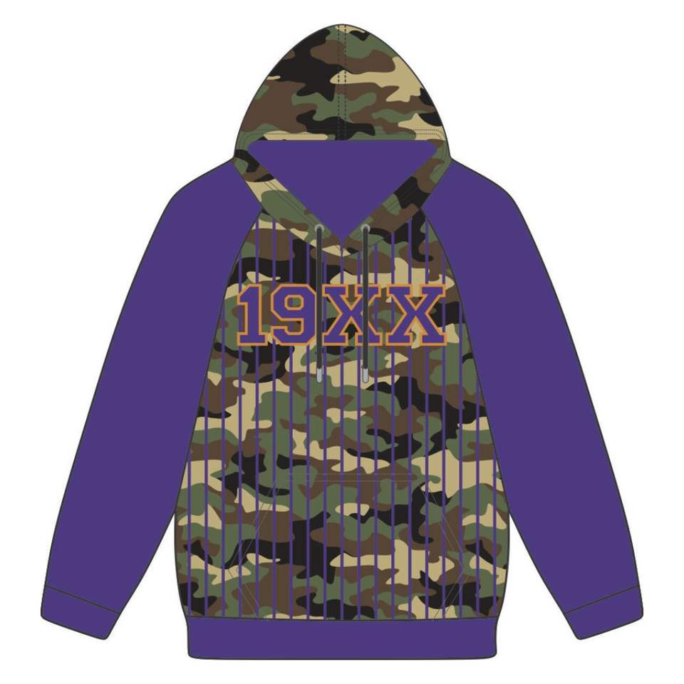 เสื้อมีฮู้ดลายพี่น้องโอเมก้ามีลายพรางสีม่วงแขนแร็กแลนผ้ากำมะหยี่โลโก้ดี้จากเรื่องการก่อตั้งเก้าปี19XX