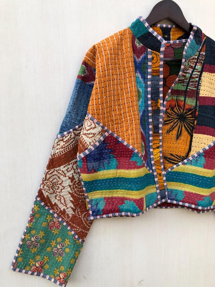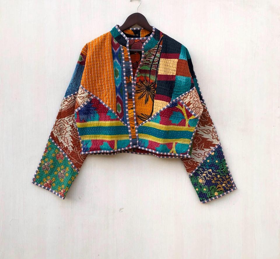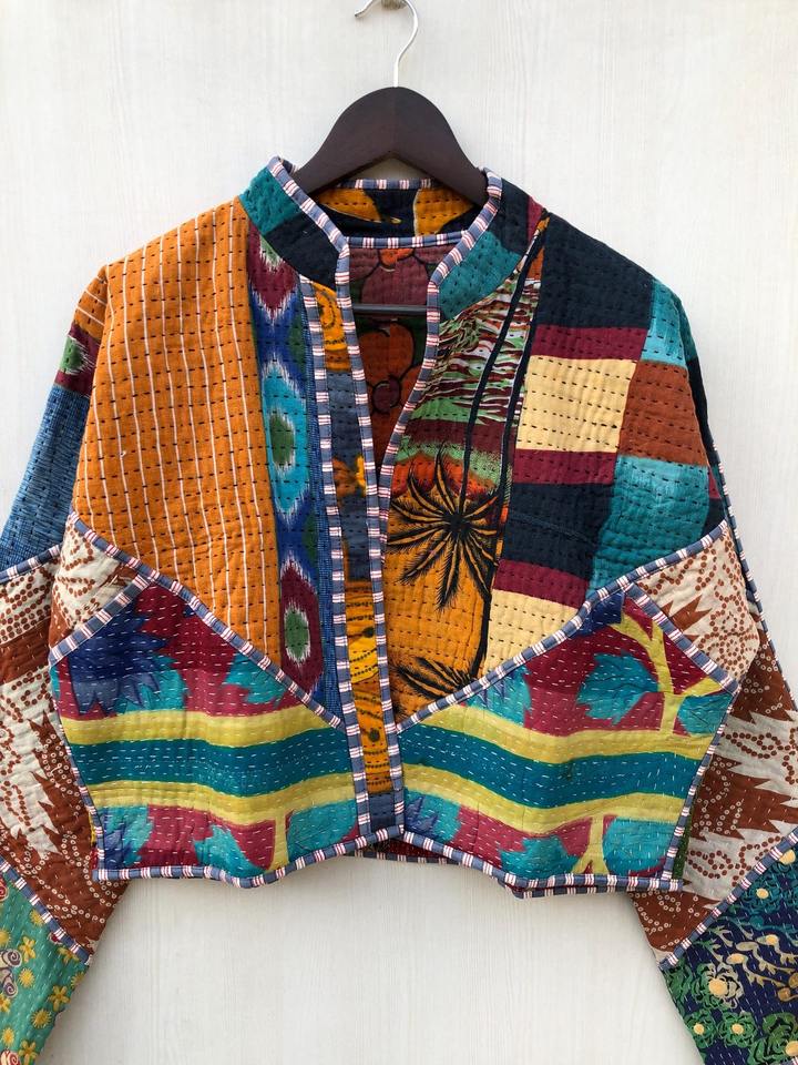 เสื้อแจ็คเก็ตสั้นทำมือท่อเสื้อแจ็คเก็ตสั้น Kantha เสื้อโค้ทฮิปปี้ทำด้วยมือสไตล์โบฮีเมียนเป็นมิตรกับสิ่งแวดล้อมหนึ่งในประเภท